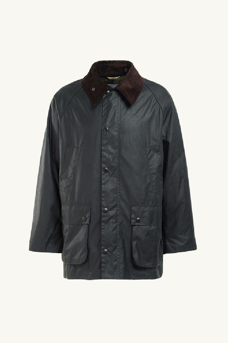 It features all the signature Barbour details: a two-way brass zipper, two large bellows pockets, two moleskin-lined handwarmer pockets, and the traditional corduroy collar.