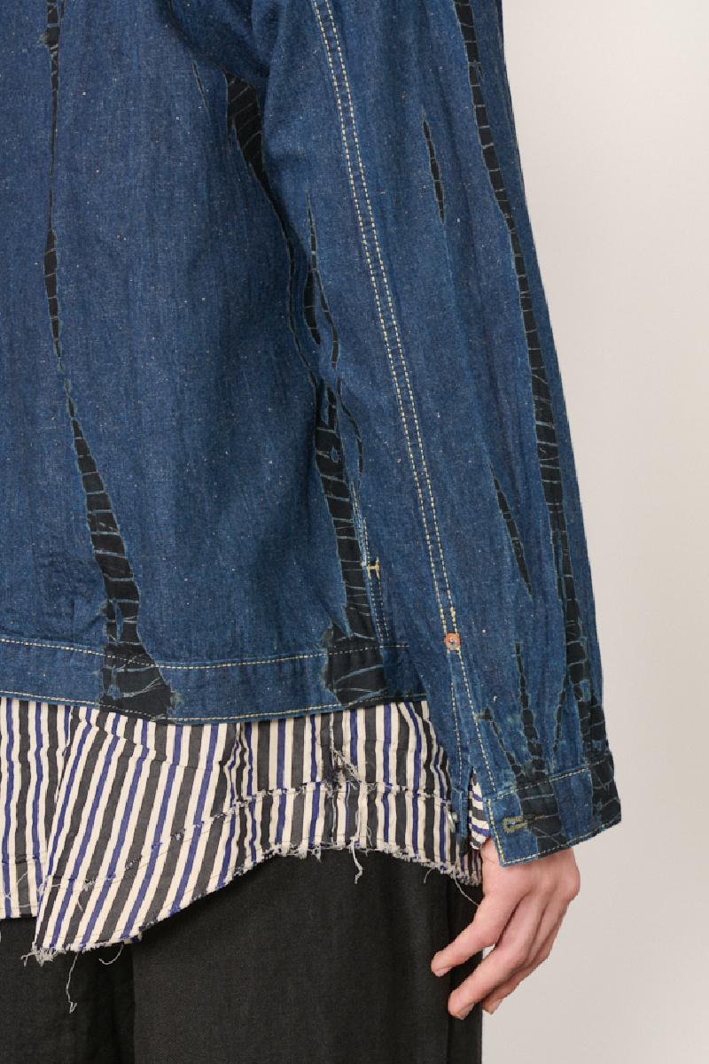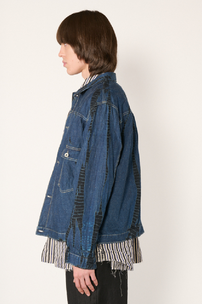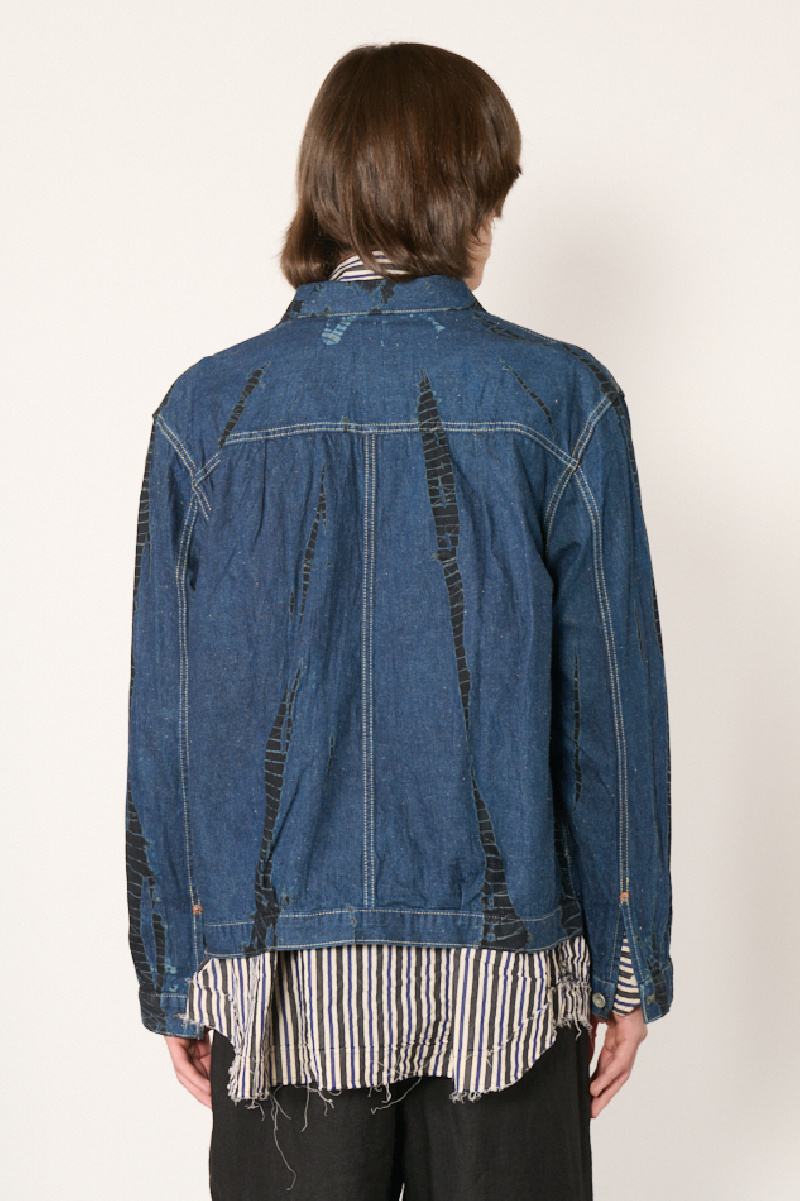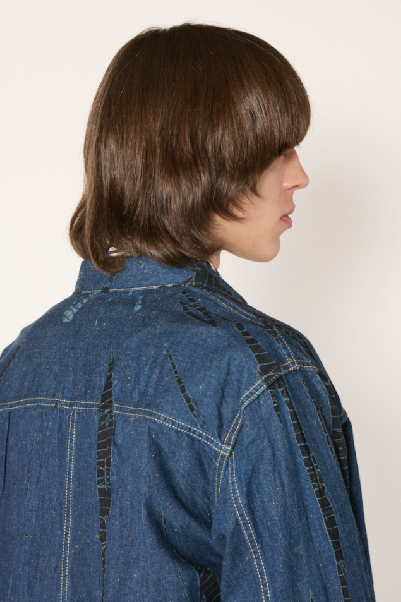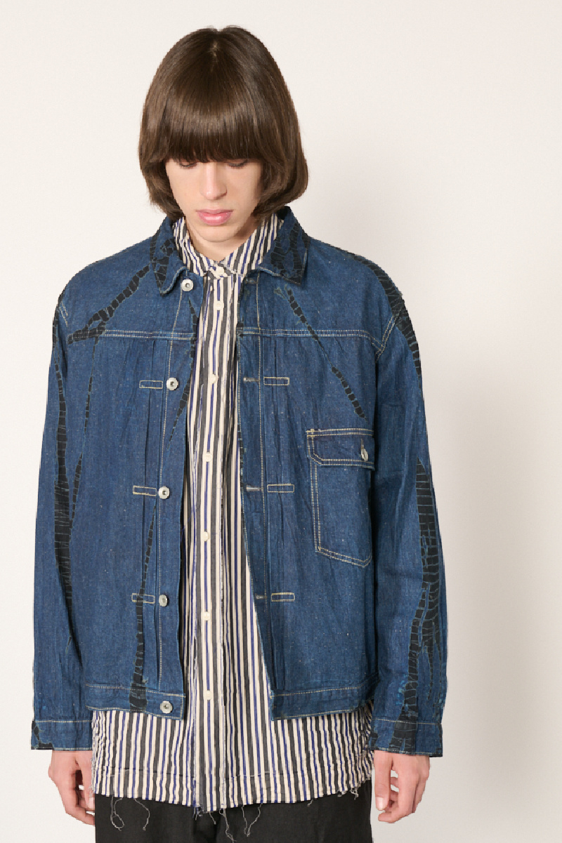 Indigo jacket crafted from cotton denim and adorned with a traditional black Shibori pattern by Suzusan.