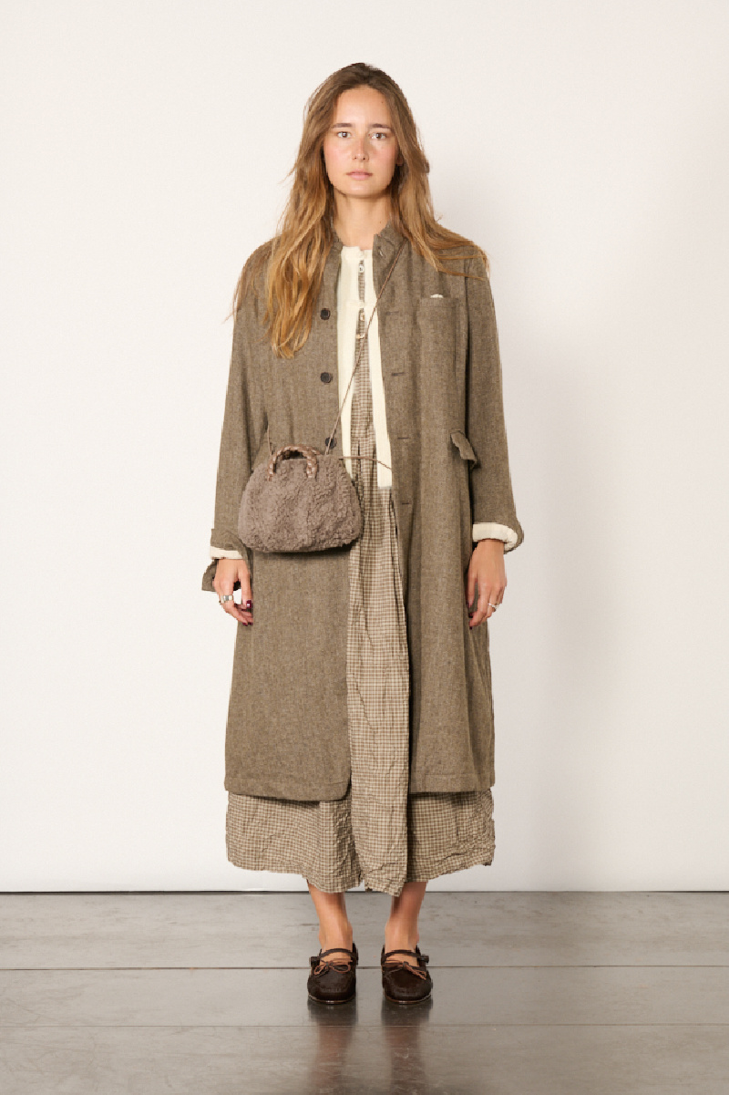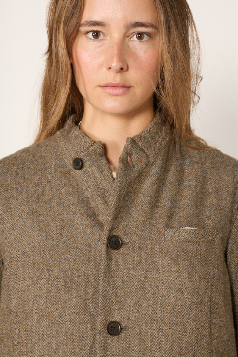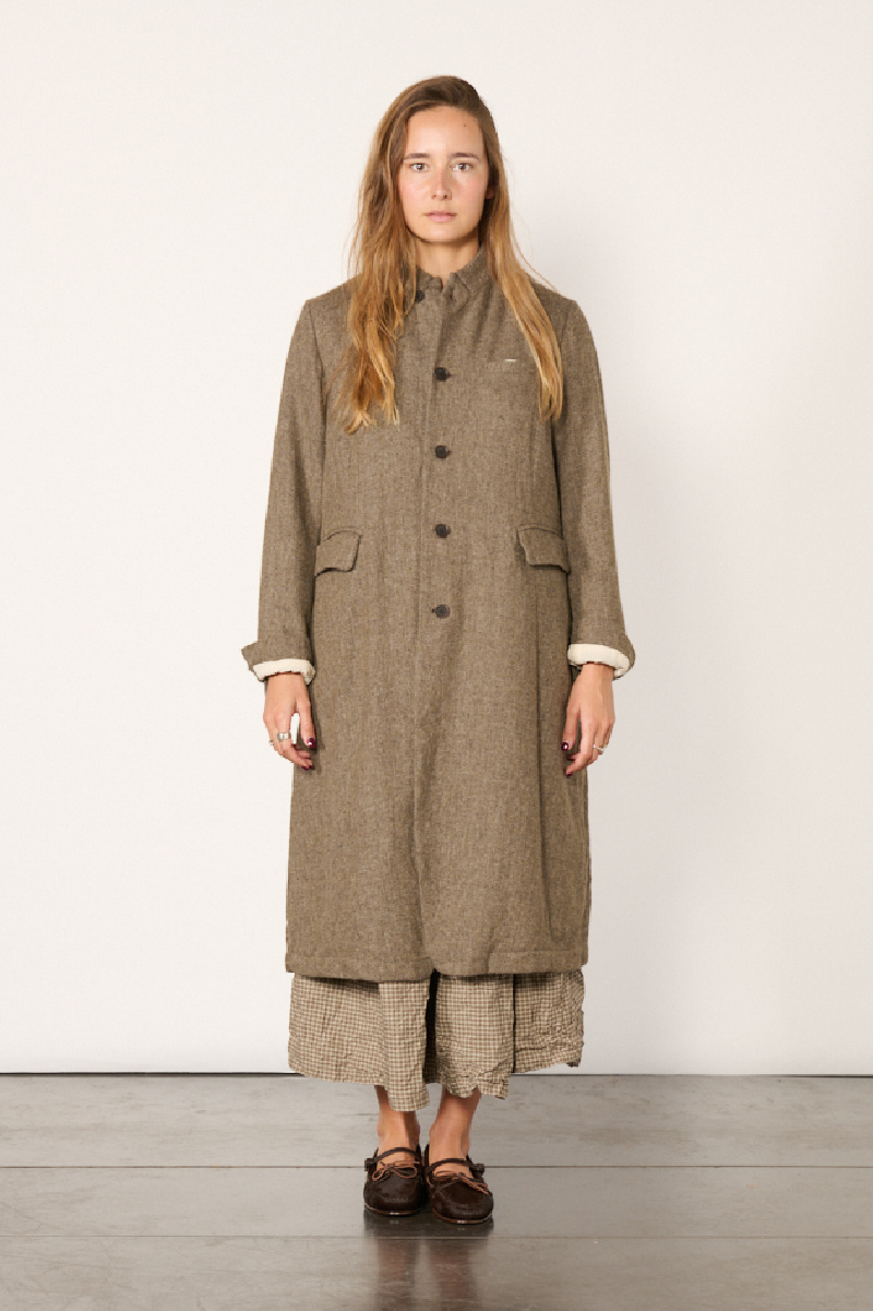 Long coat made from a lightweight, eco-friendly wool blend with a brown herringbone pattern, fully lined, from the Pas de Calais brand.