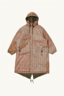 It features a long, relaxed fit with a high collar and a hood with adjustable drawcords. The press-stud fastening is complemented by two front flap pockets, while the slightly pointed, vented back hem adds a sense of movement.