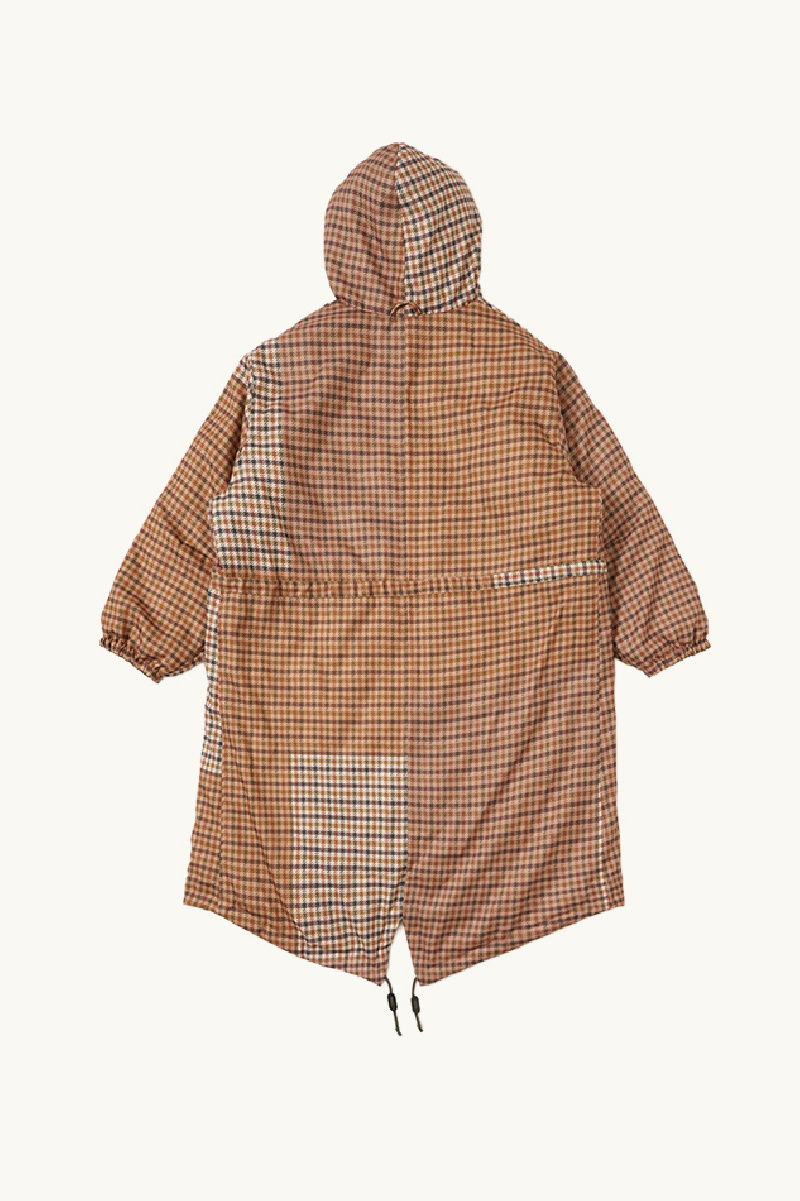 The reverse side reveals a patchwork pattern inspired by traditional tweed coats, in warm tones, and is finished with two flap pockets.