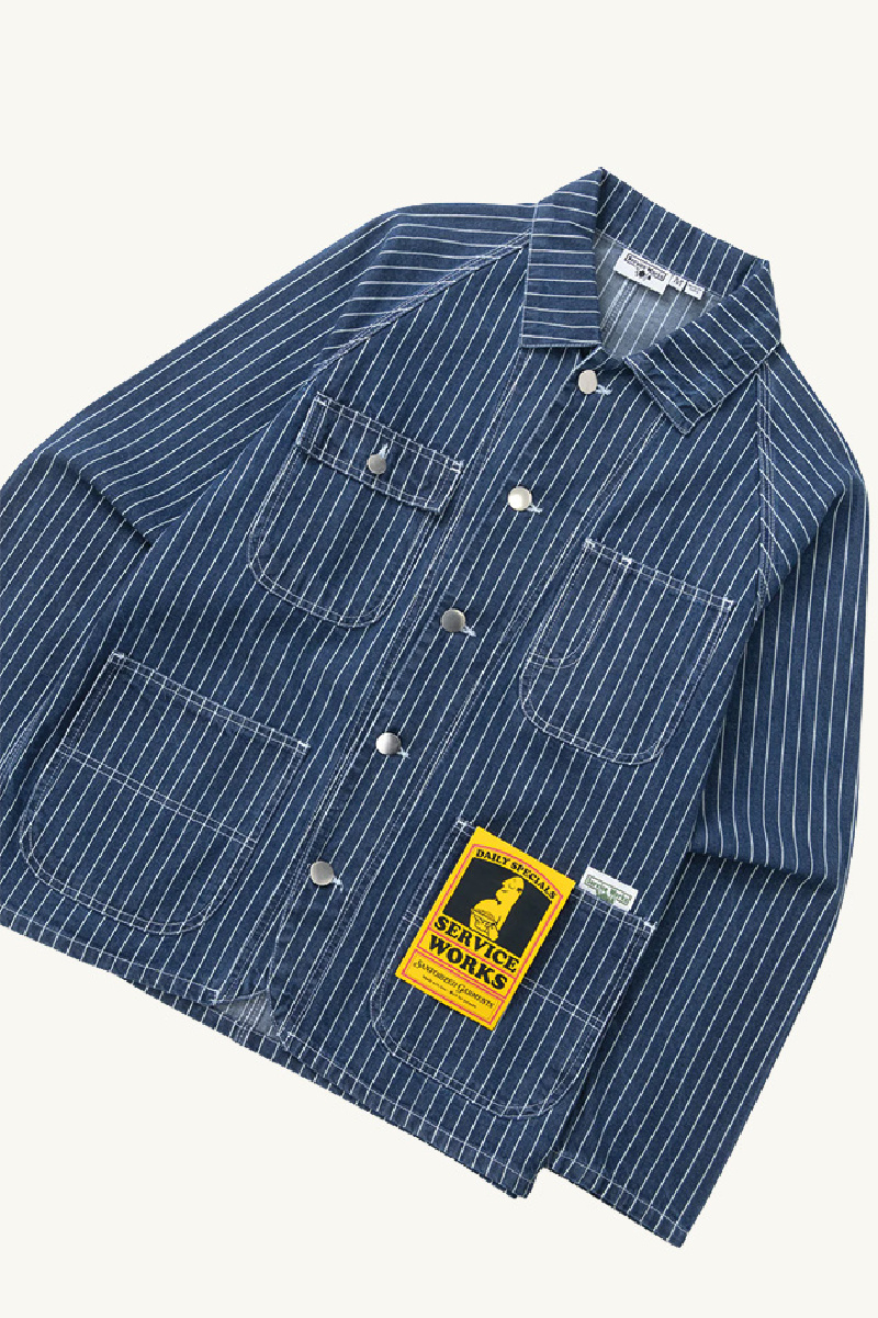 Jacket 2.0 made of light indigo denim with white stripes, from the brand Service Works.