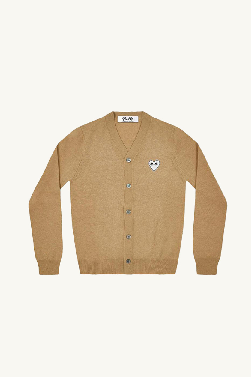 Cardigan Comme des Garçons PLAY camel in wool, with white heart embroidered logo. Straight cut, long sleeves, V-neck, button fastening, ribbed trim. Unisex.