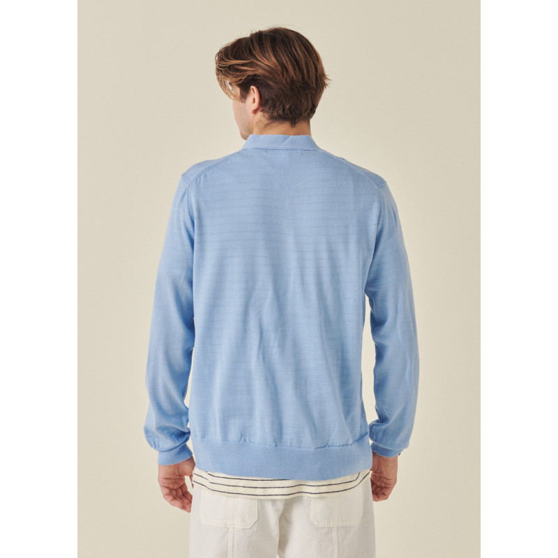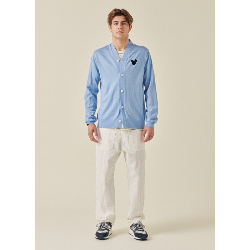 Blue wool cardigan from Comme des Garçons, strawberry embroidery on the knit, V-neck, button closure.