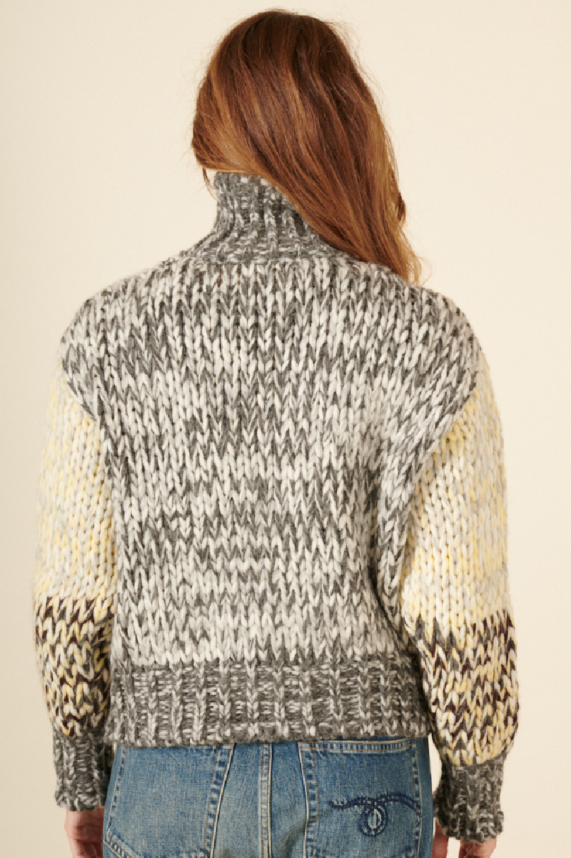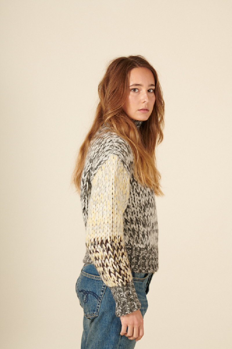 Casual chunky knitjumper from Roberto Collina in soft alpaca yarn and wool. The jumper is knitted in a yarn giving a mixed effect of light, dark grey and yellow colours. It has a stand-up collar to keep you warm.
