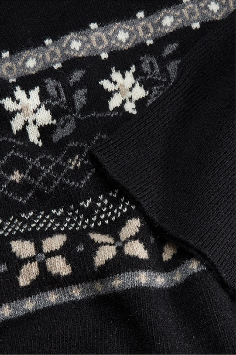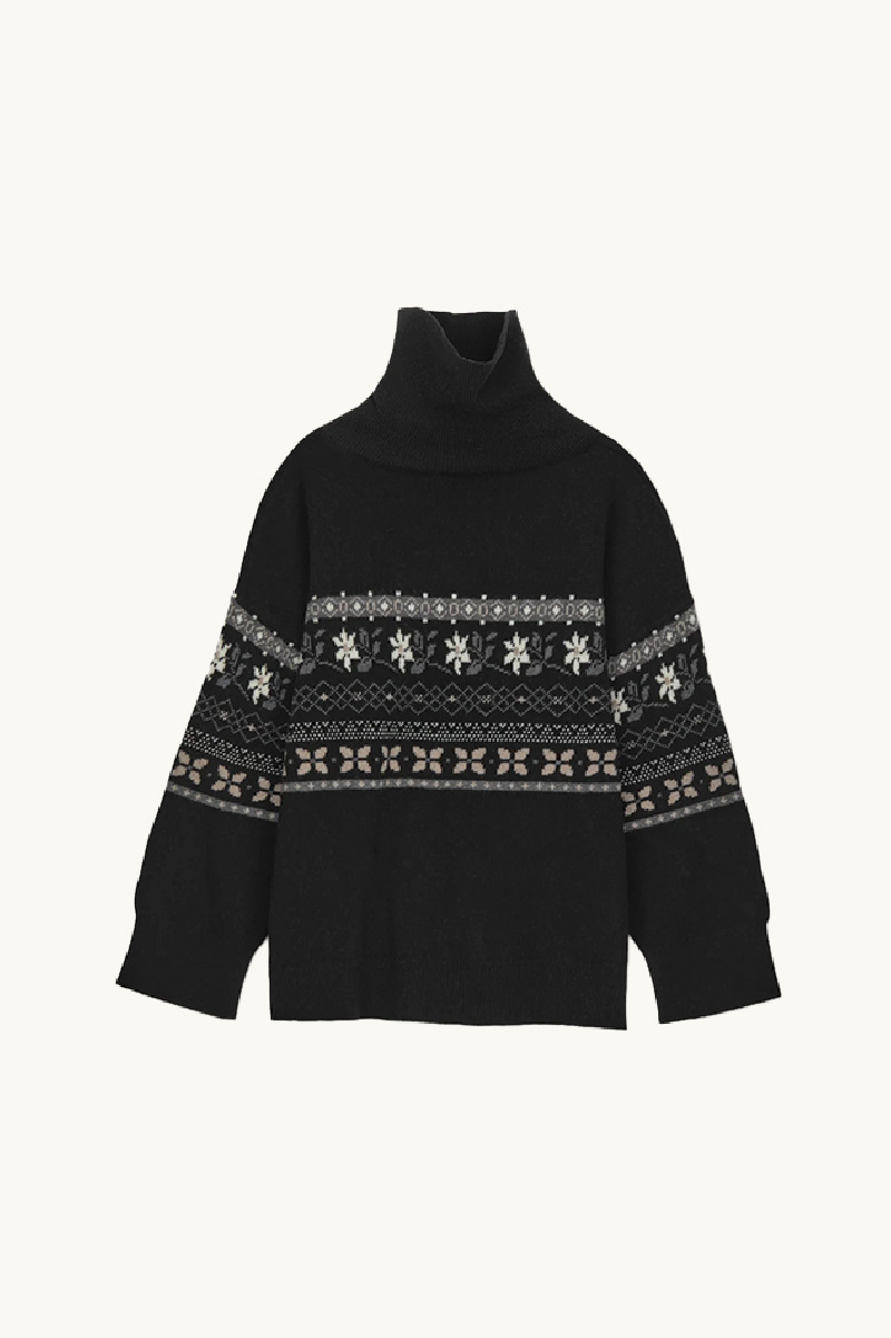 The Leonora T-neck is an ultra oversized jacquard woven wool sweater in black and gray, adorned with a distinctive pattern. It features ribbed edges at the bottom and a turtleneck for a touch of comfort and style. With its very oversized cut, for a truly ample effect, choose your usual size. If you prefer a more fitted look, opt for a size down.