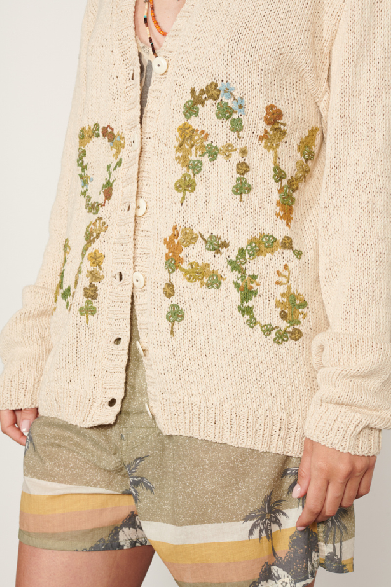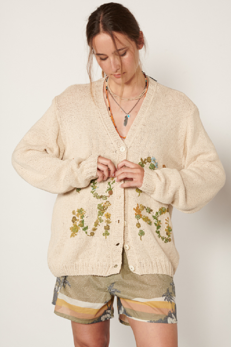 A chic, comfortable basic, this cardigan features a ribbed finish at the V-neck and neckline, as well as a buttoned front closure with a “Story MFG” motif and colorful embroidery.