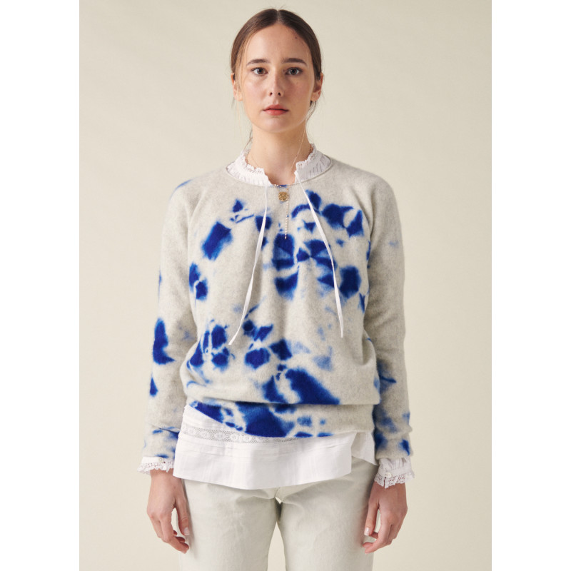 Suzusan sweater in beige and blue seamless cashmere, soft touch, long sleeves, unique washing according to the ancestral Japanese technique of Shibori, straight hem, round neck.
