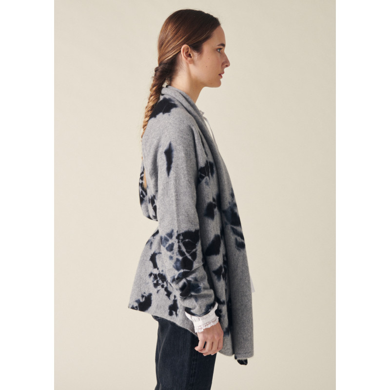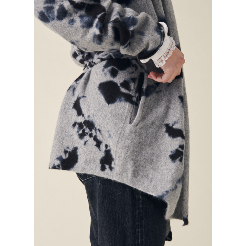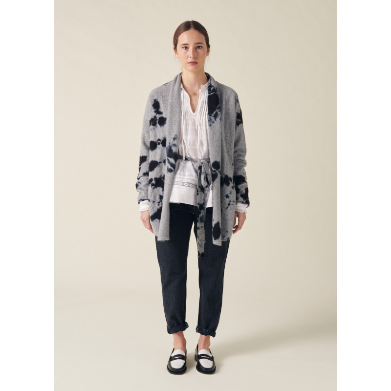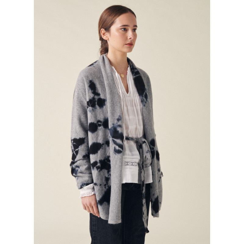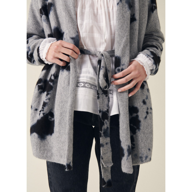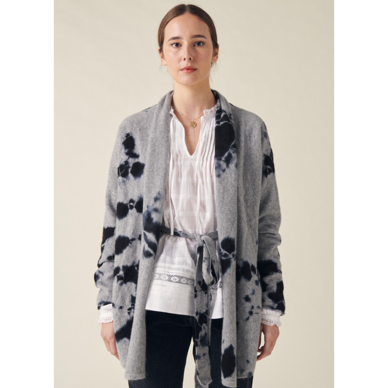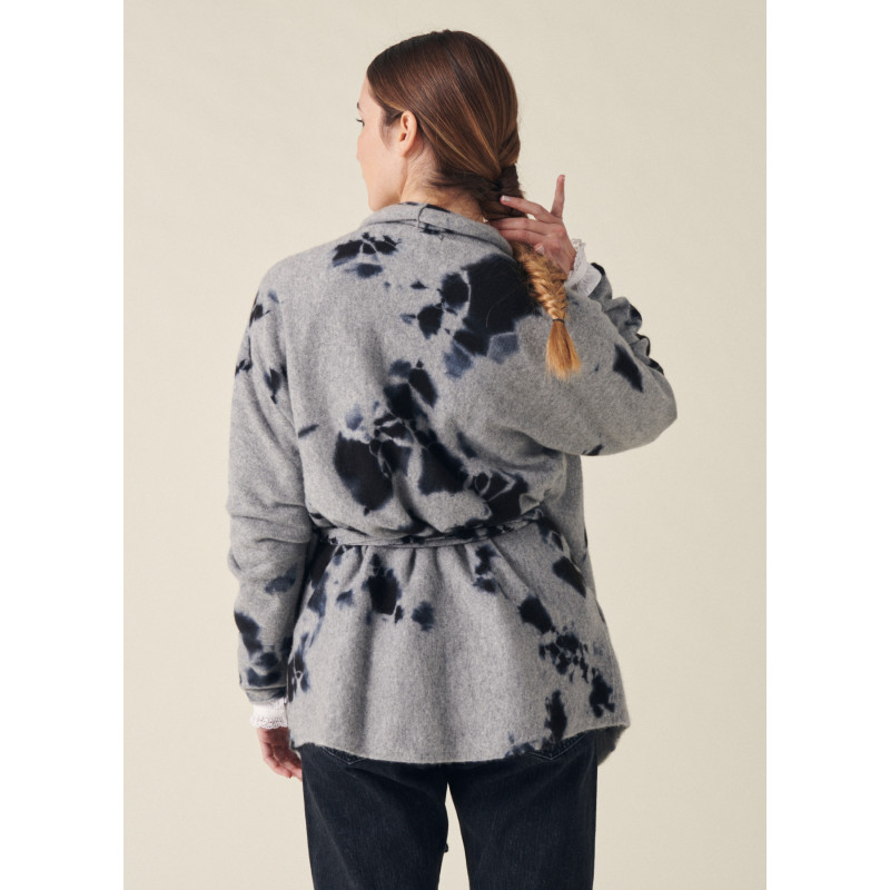 Suzusan vest, light grey and black color, long sleeves, removable belt, unique washing according to the ancestral Japanese technique of Shibori.