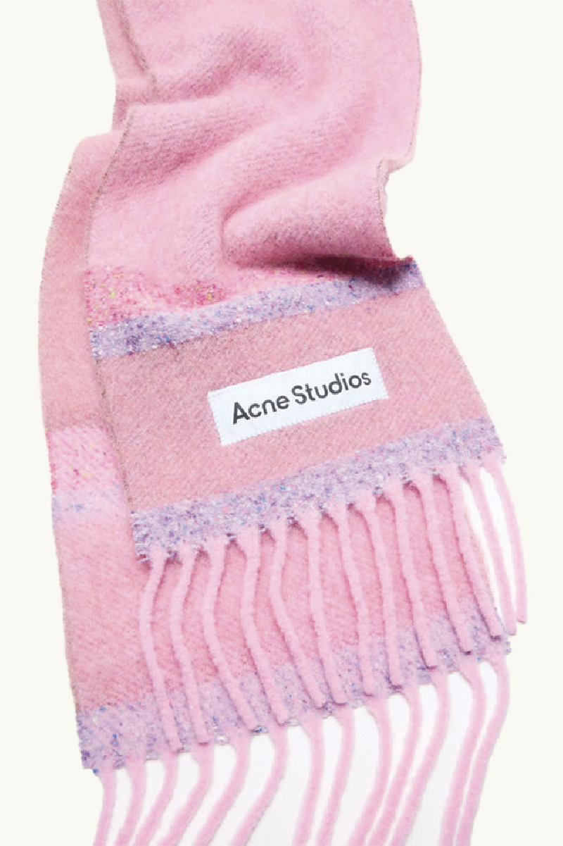 Acne Studios scarf, alpaca and wool blend in check, pink color, fluffy material, signature patch with “Acne Studios” logo.