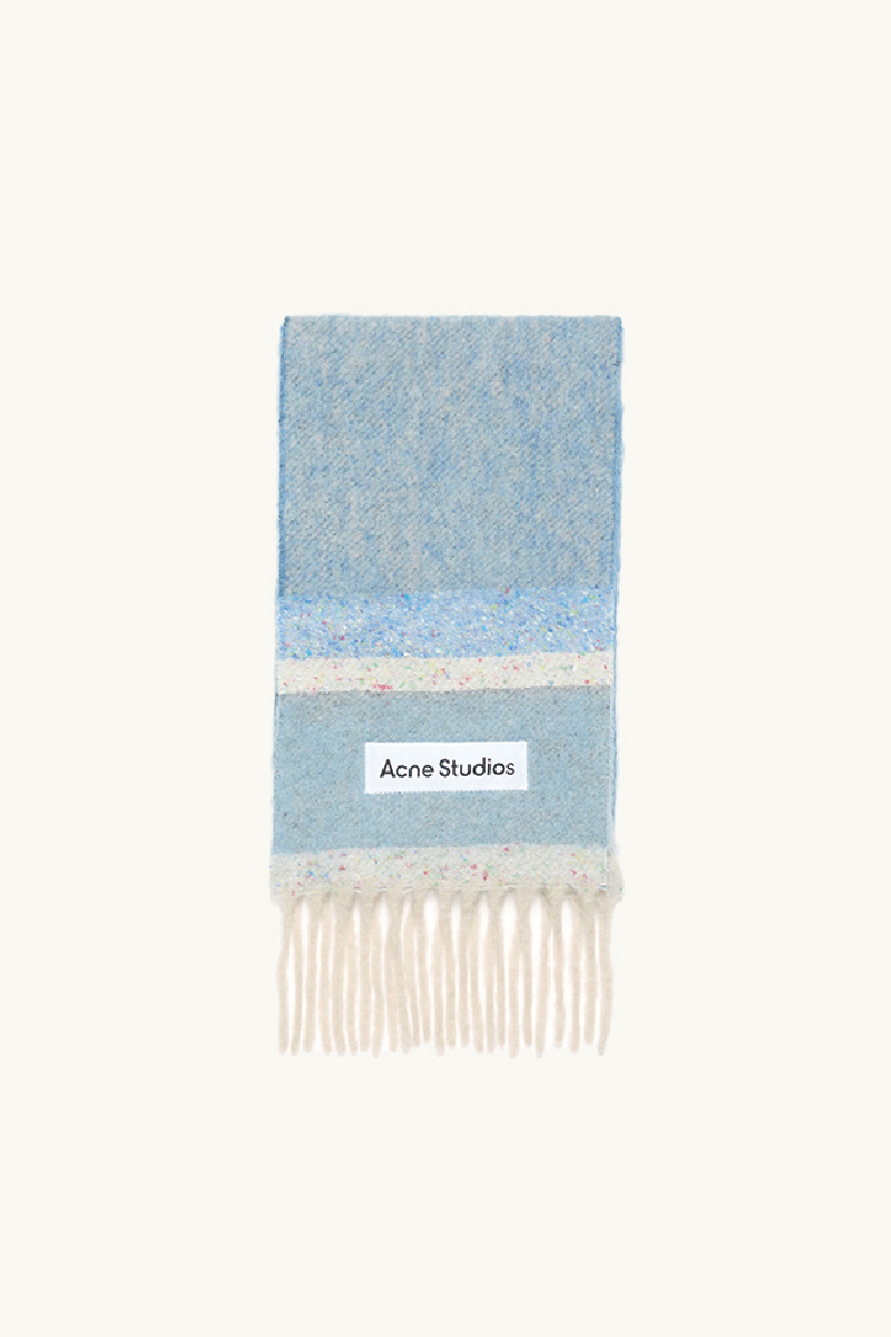 Acne Studios scarf, alpaca and wool blend in check, denim color, fluffy material, patch with “Acne Studios” logo.