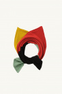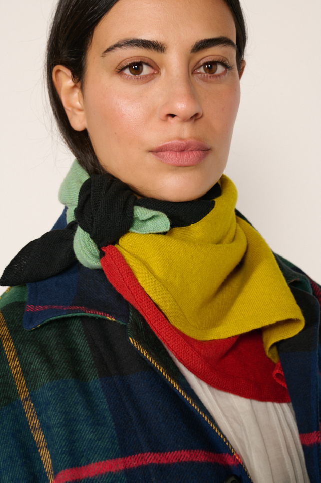 Square scarf knitted from fine, soft lambswool. Available in four colours ranging from red dulse to turmeric yellow, black and sea green.