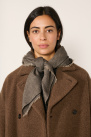 Finely woven square scarf in cashmere and wool blend with fringed details, with a delicate geometric pattern in beige/brown tones, from the brand Maison de Soil.