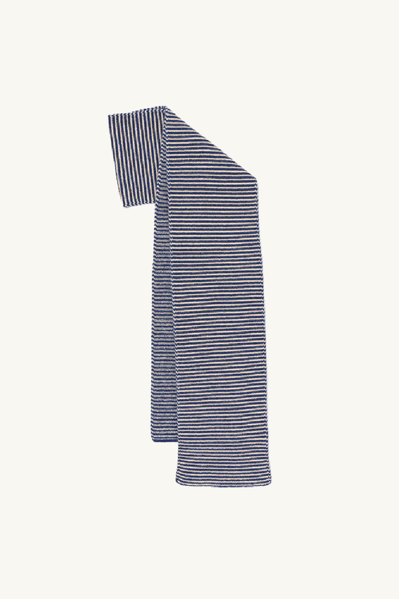 Large hand-knitted scarf with thin navy and beige foam stitch stripes, from the brand Jo Gordon.