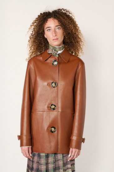 It features a loose straight cut embellished with a lavallière collar and an asymmetrical cape/hood with the brand's print on the back.