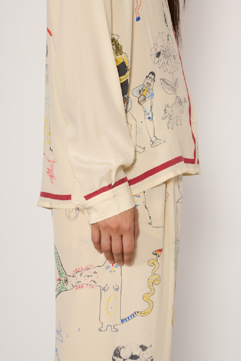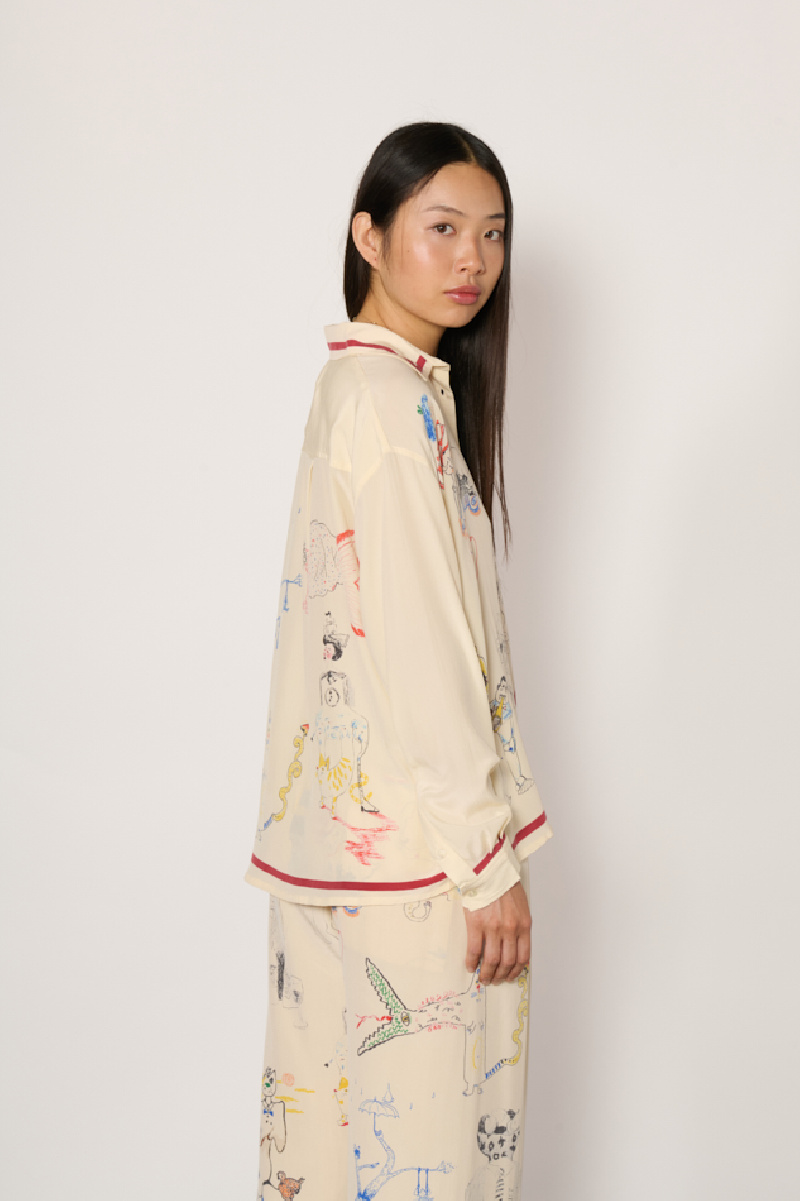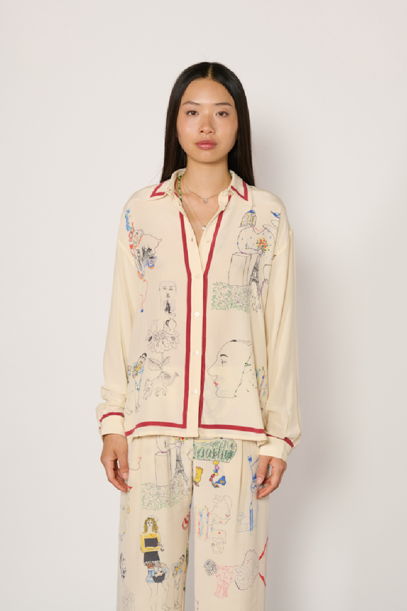 It features a loose, flowing cut, pearl button closure, classic collar, buttoned cuffs, straight hem, all embellished with a burgundy band.