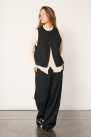 It features a loose fit with an asymmetrical hem, tone-on-tone covered buttons at the front, a gathered bib, a stand-up collar and buttoned cuffs with raw edges.