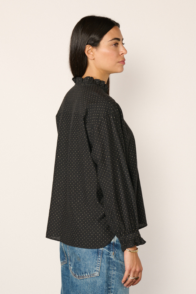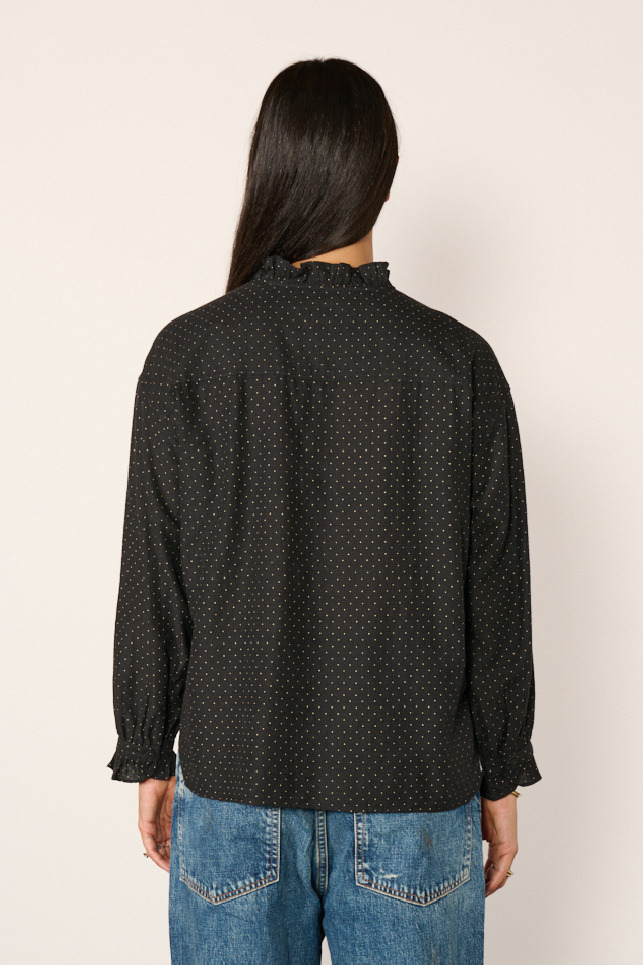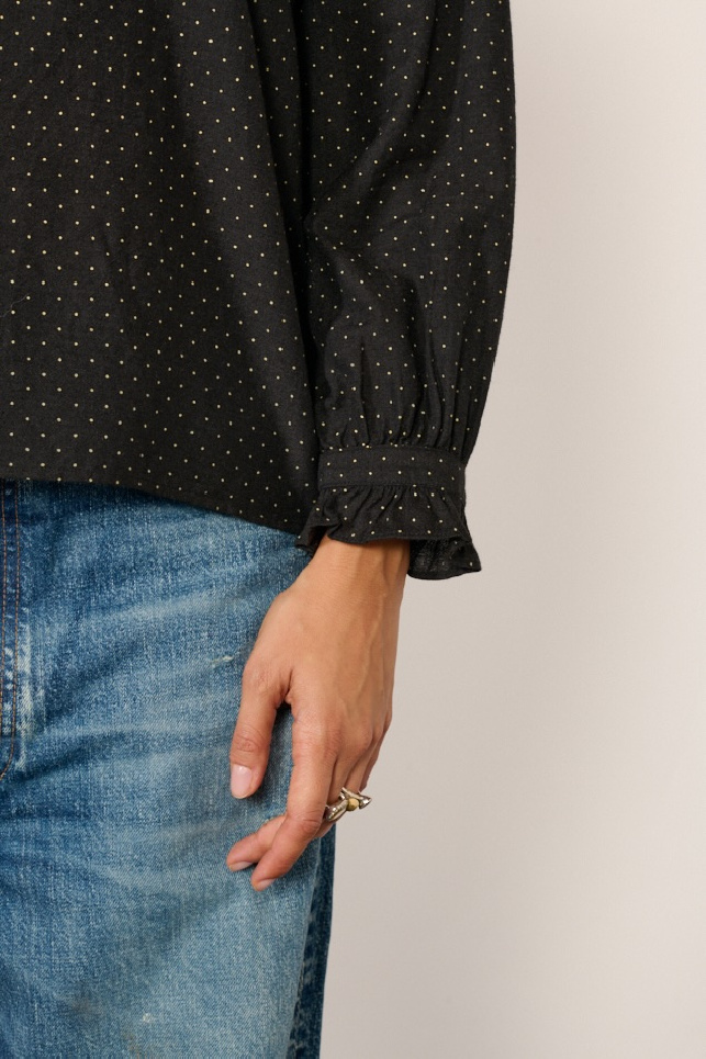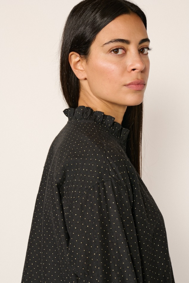 Black polka dot blouse made in a blend of wool, cotton and silk by Maison de Soil.