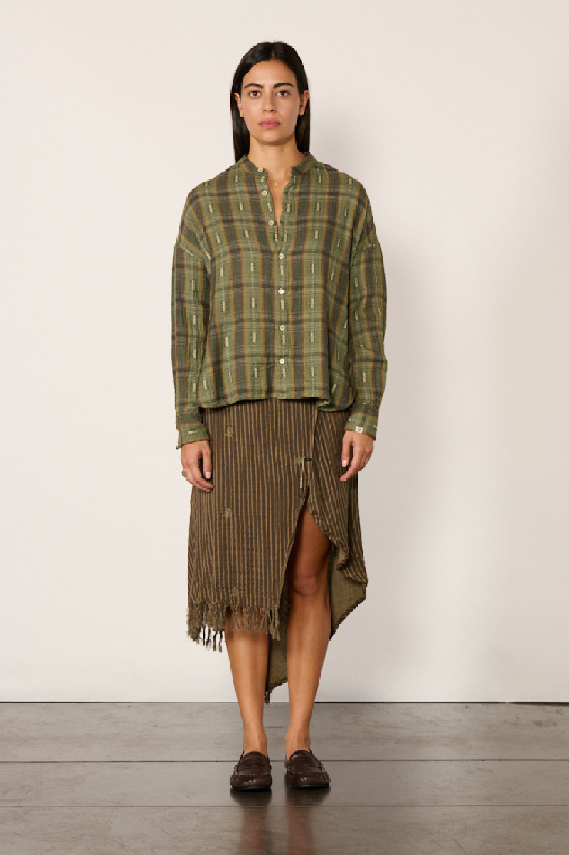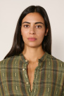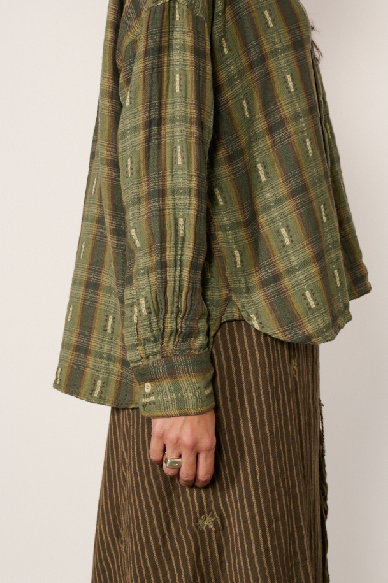 Its plaid pattern, composed of various shades of green, along with woven details, gives the shirt a refined and unique touch.