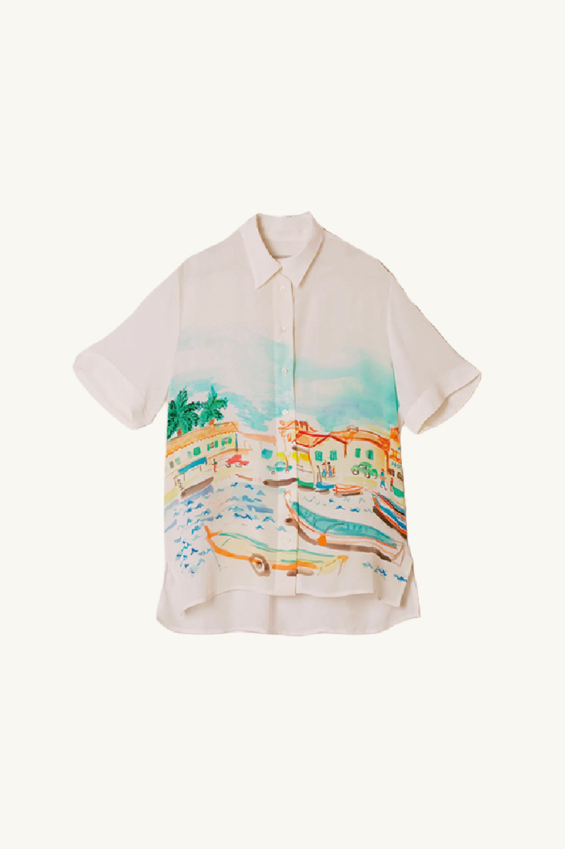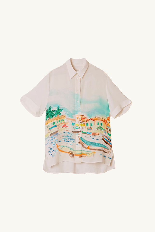 Short-sleeved shirt made from fluid cream silk crepe with a colorful watercolor print, from the Mii brand.