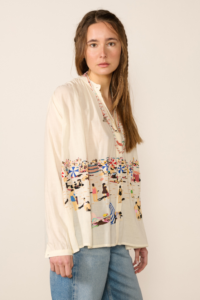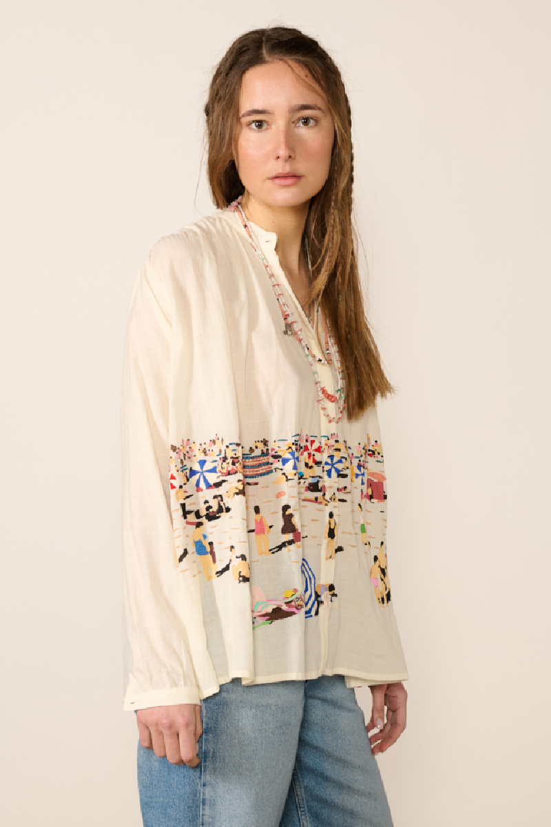 It features ample volume with gathers at the front and back, colorful embroidery on the front with a “Summer Beach in Provence” theme, a stand-up collar, slim buttoned cuffs, and a straight hem.