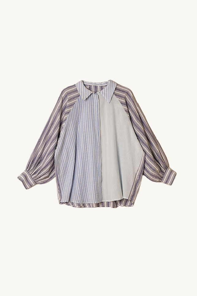 Lightweight patchwork shirt in khadi cotton and silk, hand-woven and delicately striped in shades of blue, from the Mii brand.