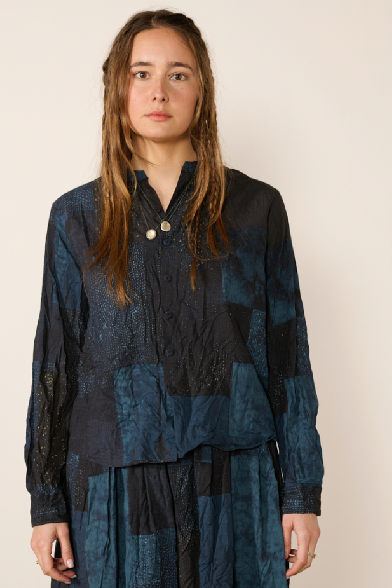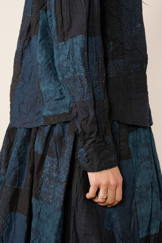 Crafted from Tsugihagi printed cotton, a traditional Japanese patchwork technique that combines different patterns for a unique effect. The fabric, printed in Kyoto, is softened and lightly crinkled for a natural, gentle feel.