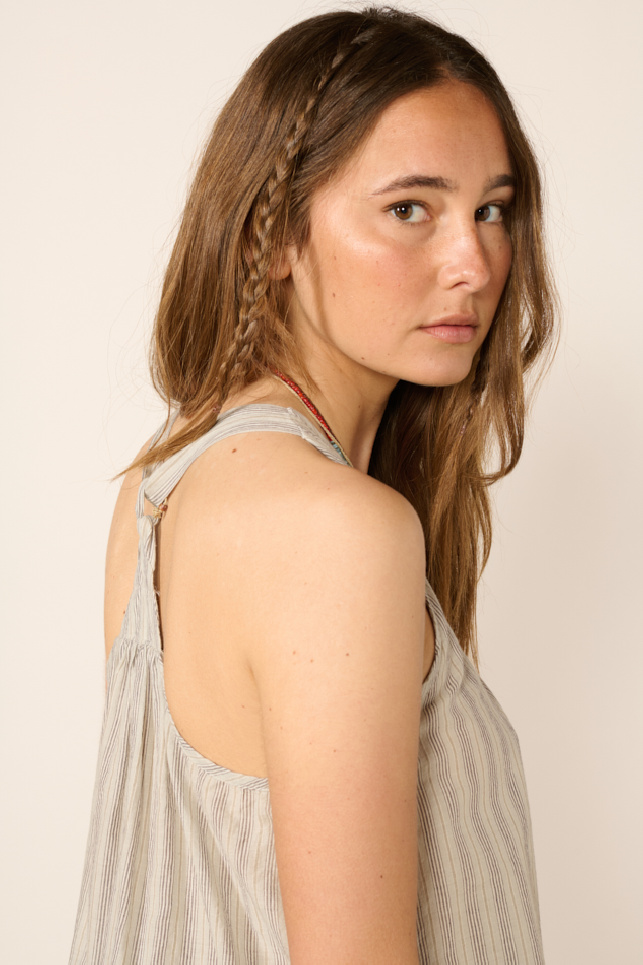 Hand-woven top made of khadi cotton voile with stripes in natural blue/grey tones, from the brand BSBEE.
