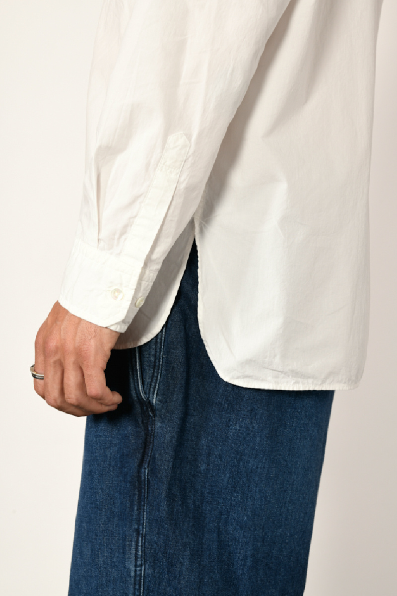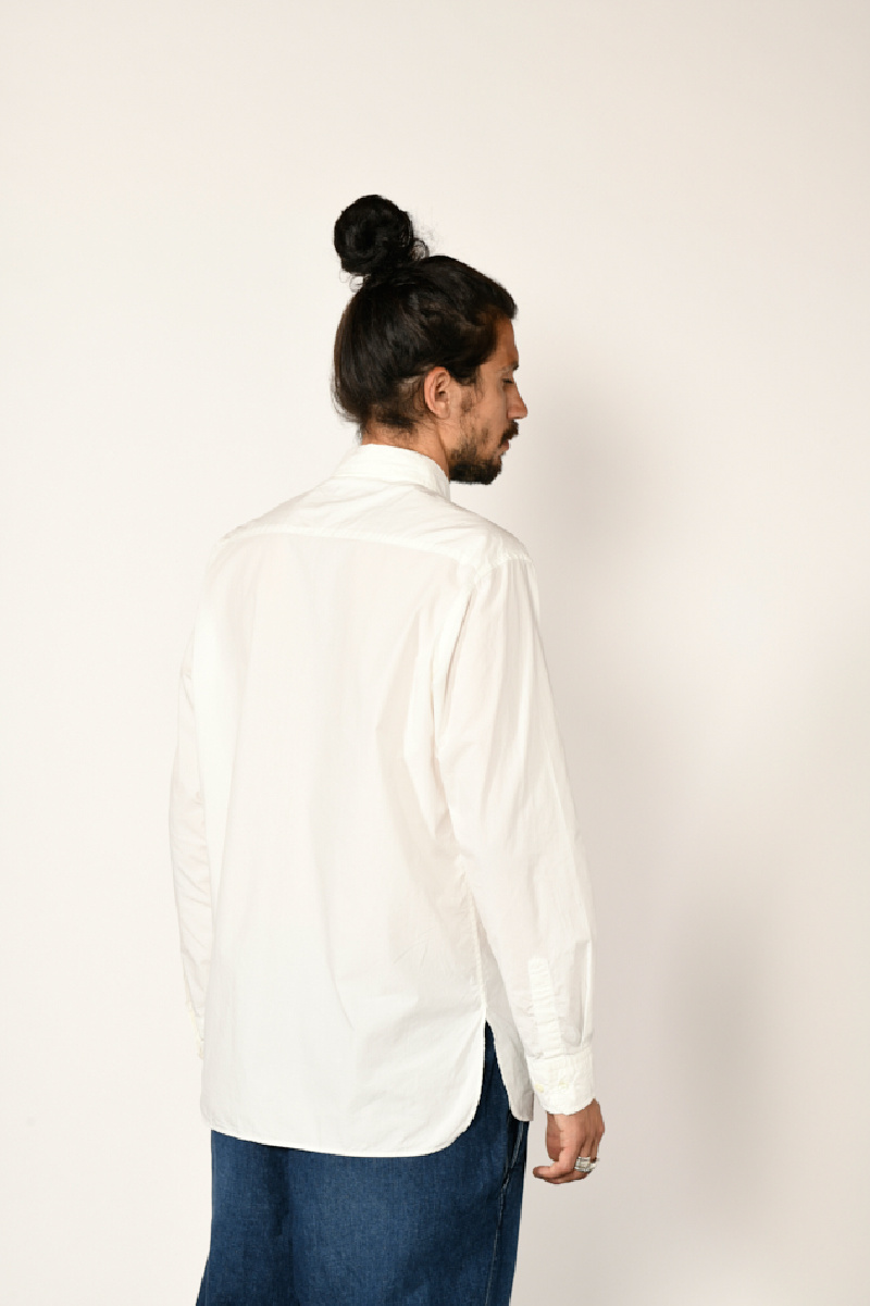 It offers a straight cut, classic collar, chest pocket and rounded side slits.