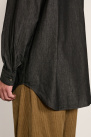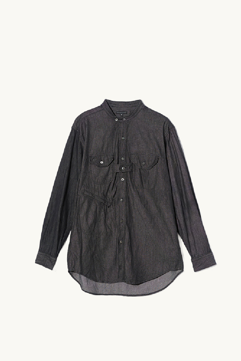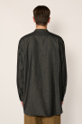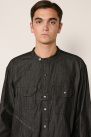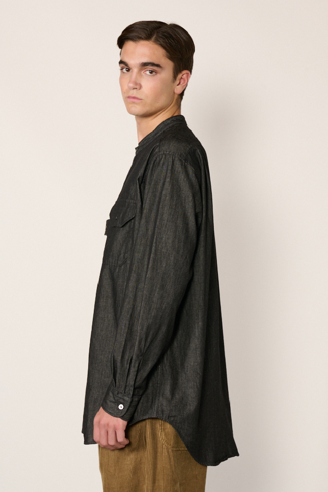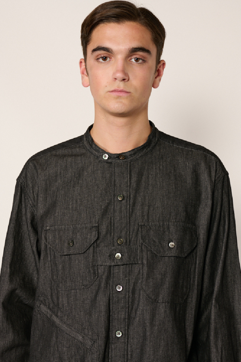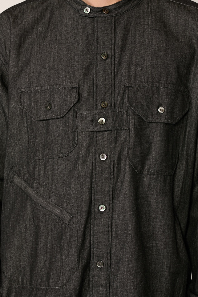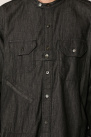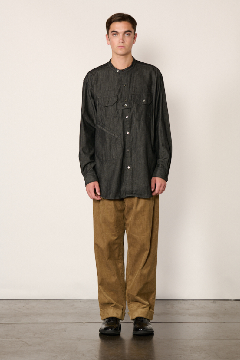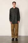It features a loose straight fit, central button placket, a banded collar with buttons, dropped shoulders, two flap chest pockets and a front zip pocket.