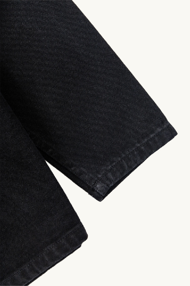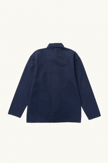 It features a loose, relaxed fit, a classic collar with a button placket, and a chest patch pocket.