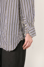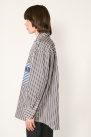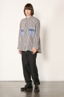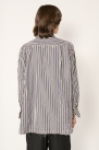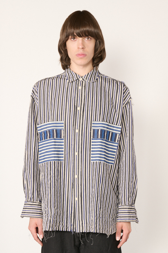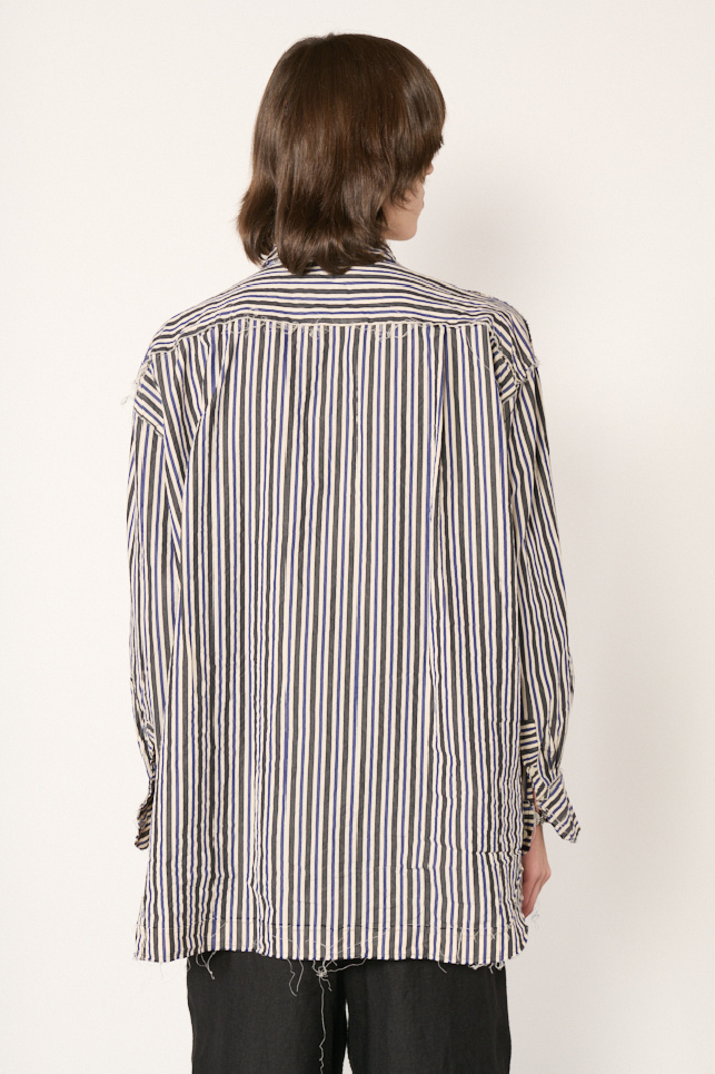 The raw, frayed-edge seams add a subtle touch of texture, while a back yoke and sleeve cuffs break up the stripe pattern with a perpendicular layout, offering a striking graphic contrast.