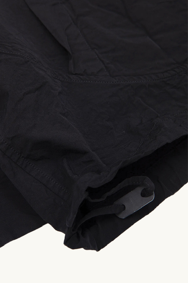 It features a relaxed, loose fit with a classic shirt collar, patch pockets with button closures at the front, and a straight hem finished with adjustable drawstrings for a customizable shape.