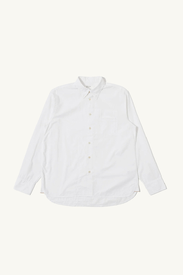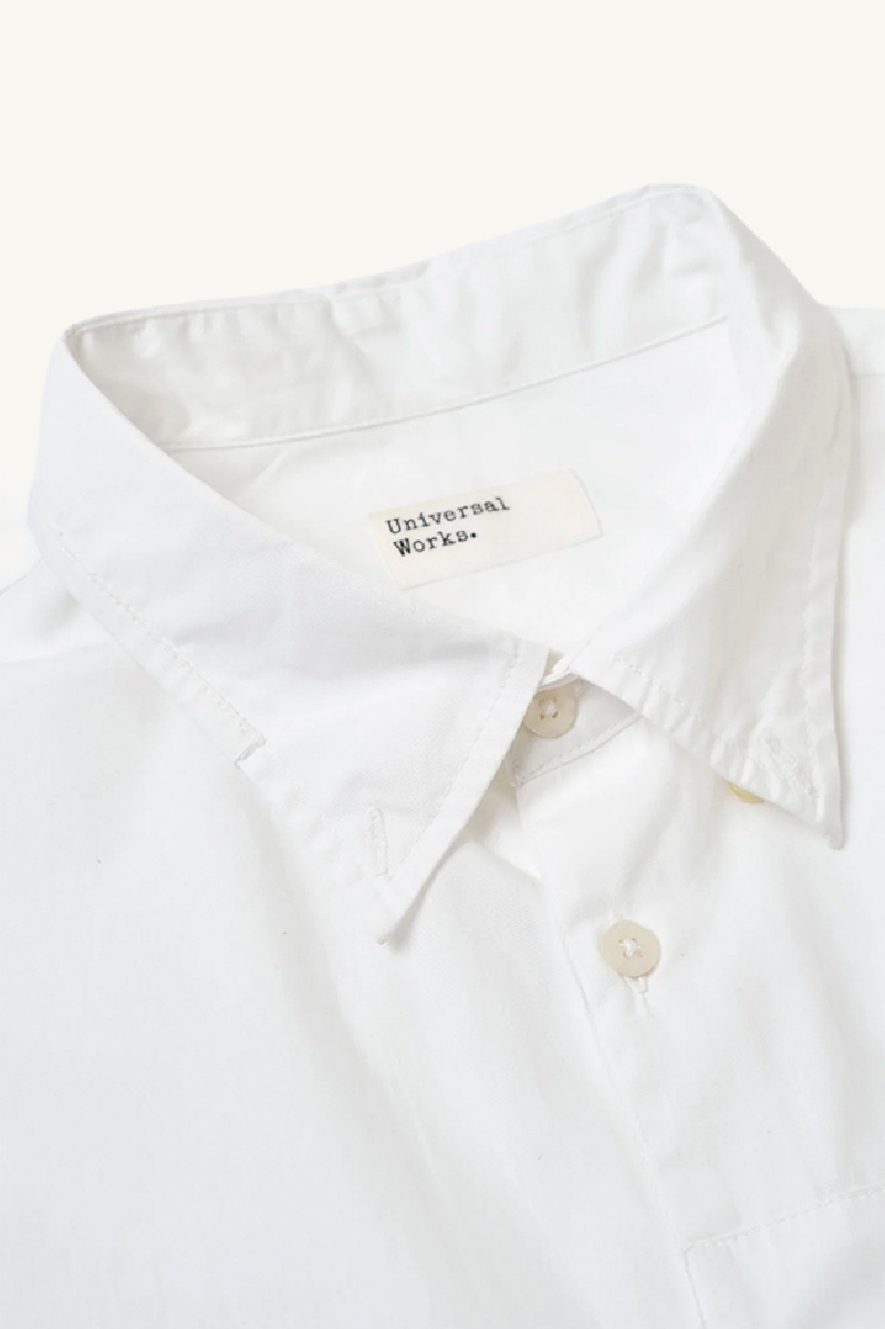 Patched Lazy Day shirt made from white poplin with patchwork detailing, from Universal Works.