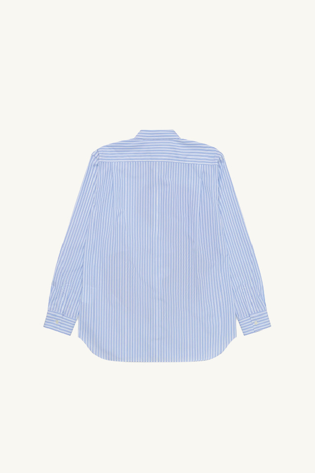 It offers a straight cut with a classic pointed collar, a rounded hem, a mother-of-pearl placket on the front and buttoned cuffs.