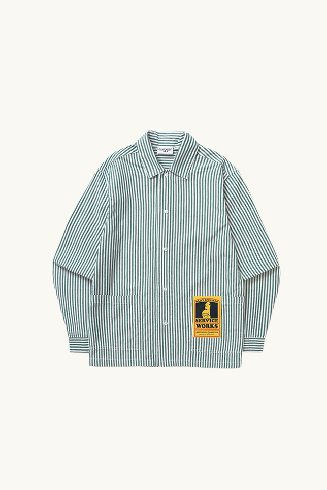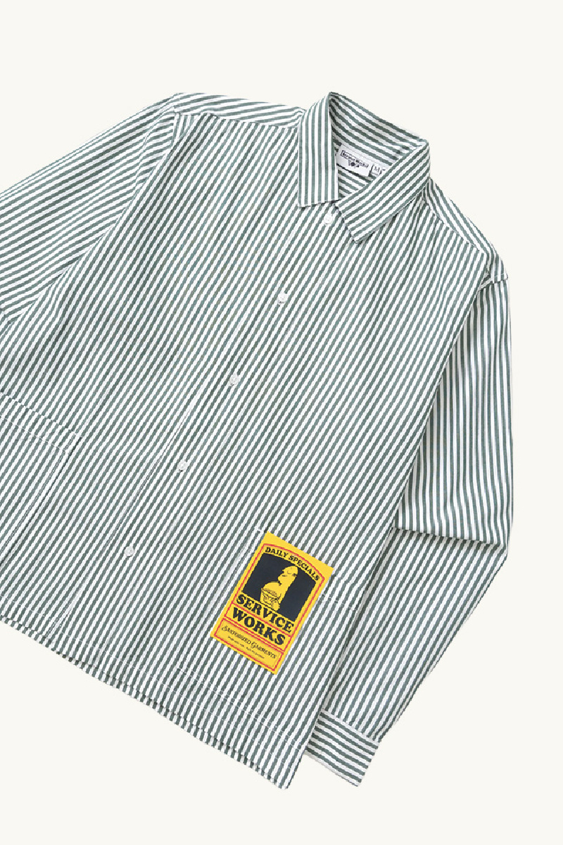 Waiter Shirt in green and white stripes, crafted from cotton poplin, by Service Works.