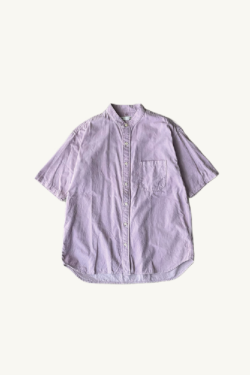 It offers a relaxed fit with ample volume, an officer collar with buttoned opening, a rounded hem and a patch pocket on the chest.