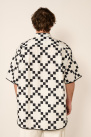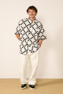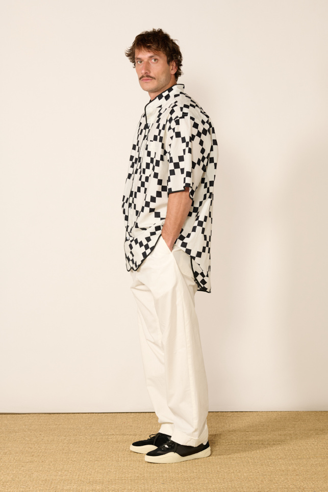 It offers an oversized cut with a black border, an officer collar, lowered shoulders, a rounded hem and a patch pocket on the heart side.