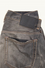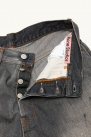 Mid-rise waist with straight leg length to the knees, five-pocket construction, button closure, and a leather logo patch.