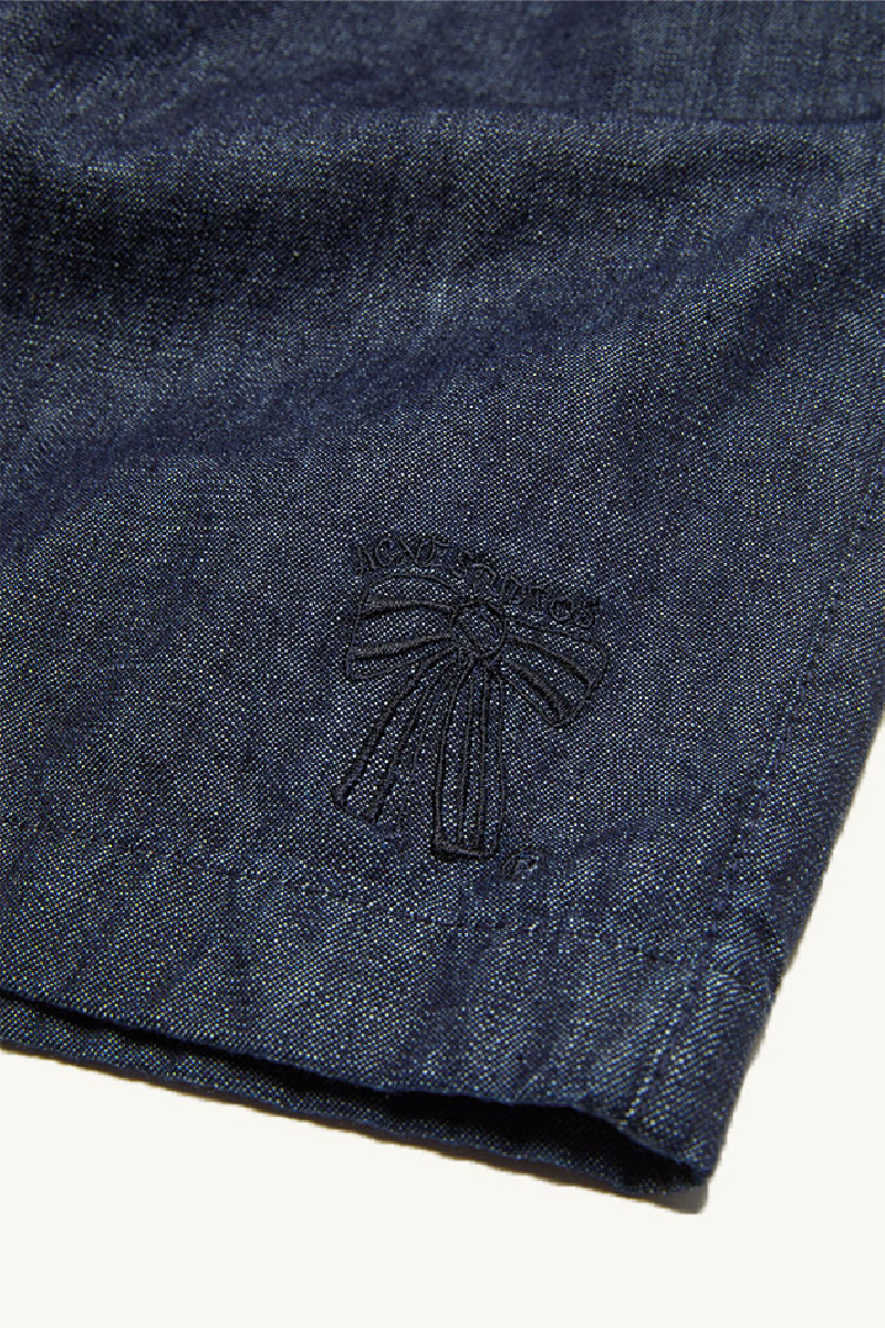 They feature a relaxed fit with a tone-on-tone embroidered bow on the hem, an elasticated waistband with logo buttons and a faux fly, side pockets in the seams, and a back pocket.