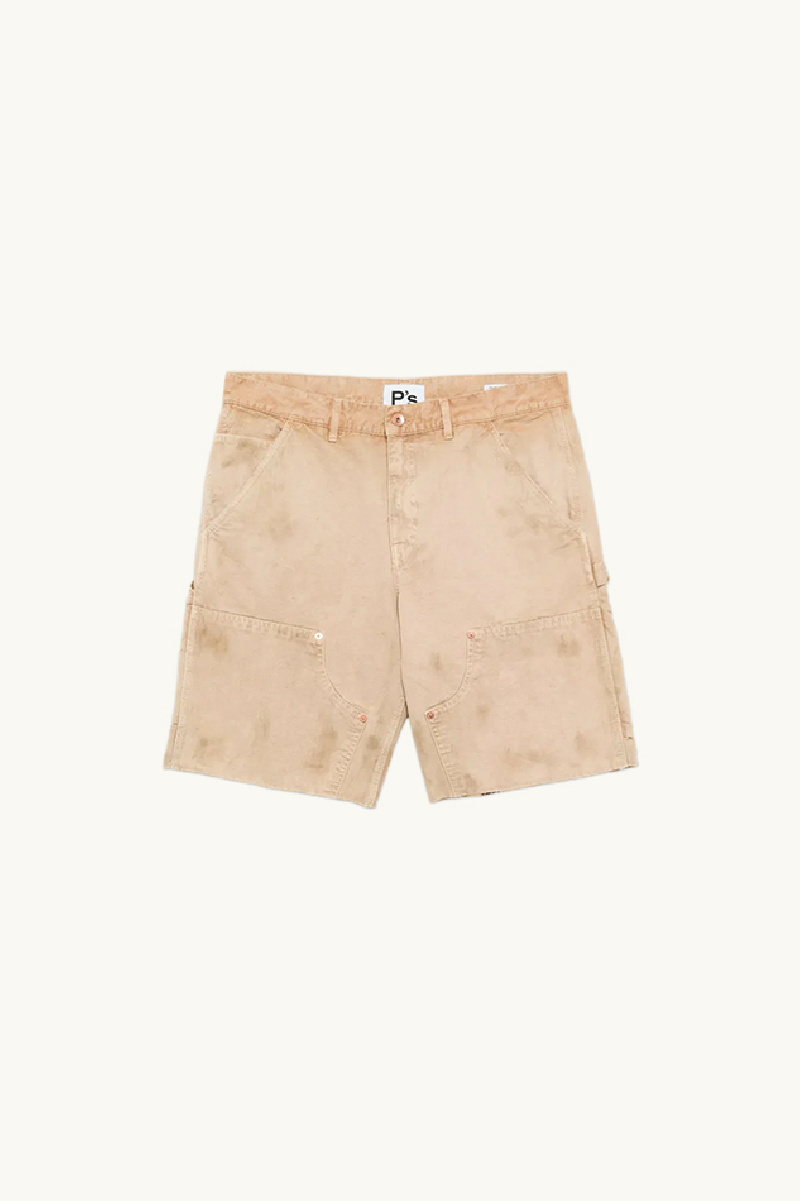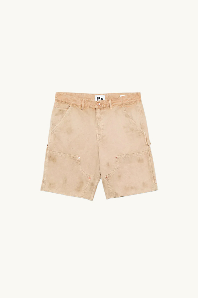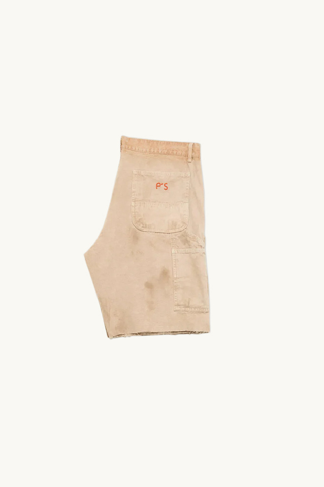 It features a carpenter-inspired design with a loose, relaxed fit and a knee-length cut. It stands out with classic workwear-style pockets at the front and back, as well as double knee reinforcement with raw-edge finishes.