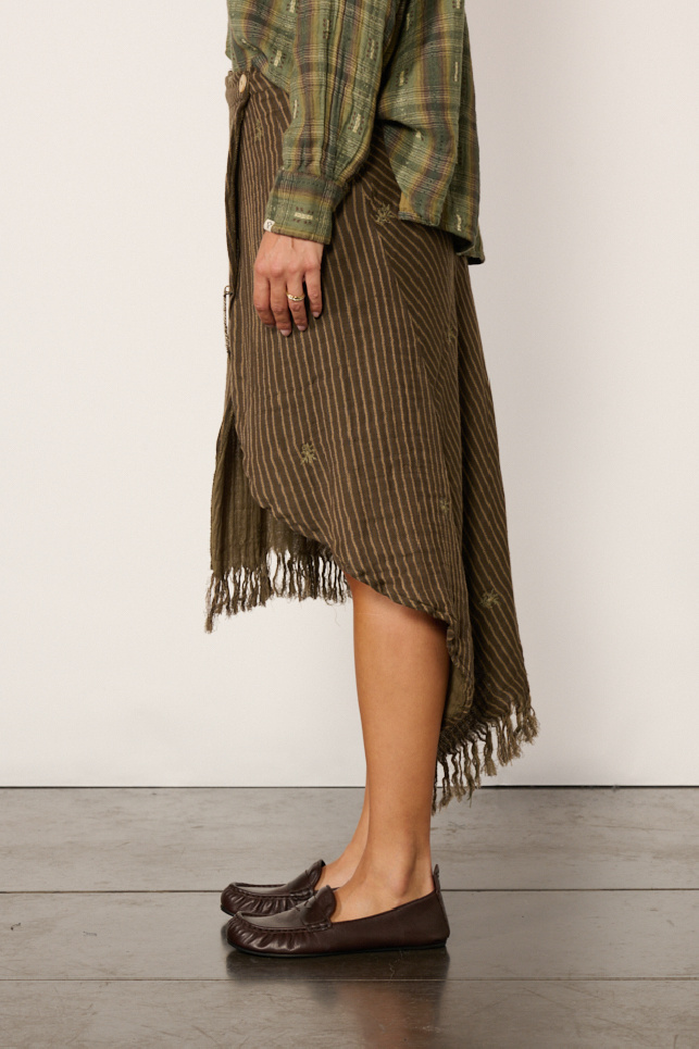 It features an asymmetric, wrap-style, mid-length cut with a slit fastened by a pin, fringed details, and two buttons on the waistband.