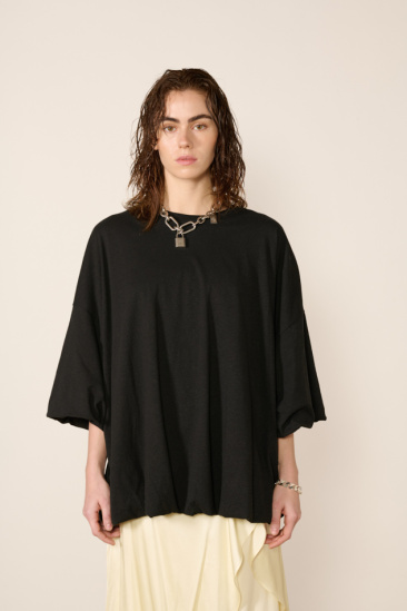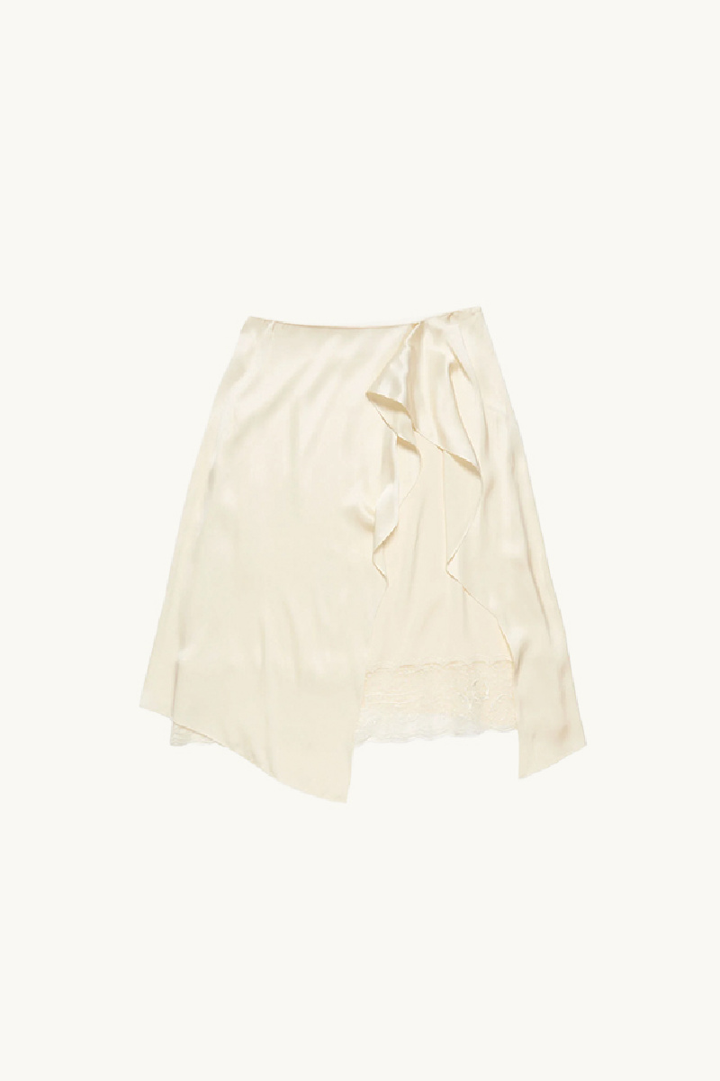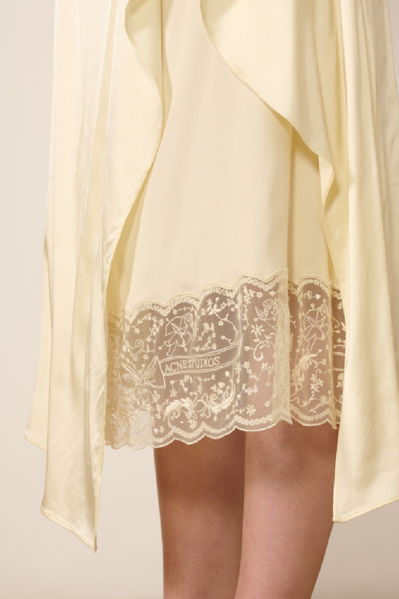 The design is based on a ruffled construction, enhanced by layered lace detailing featuring the logo.