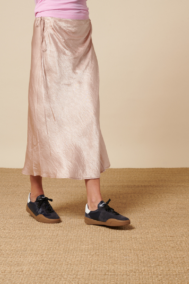 Satin wrap skirt from Acne Studios, gold, fluid, light cut, mid-length, mid-high waist and ankle-length. Tie fastening at waist and contrasting topstitching.