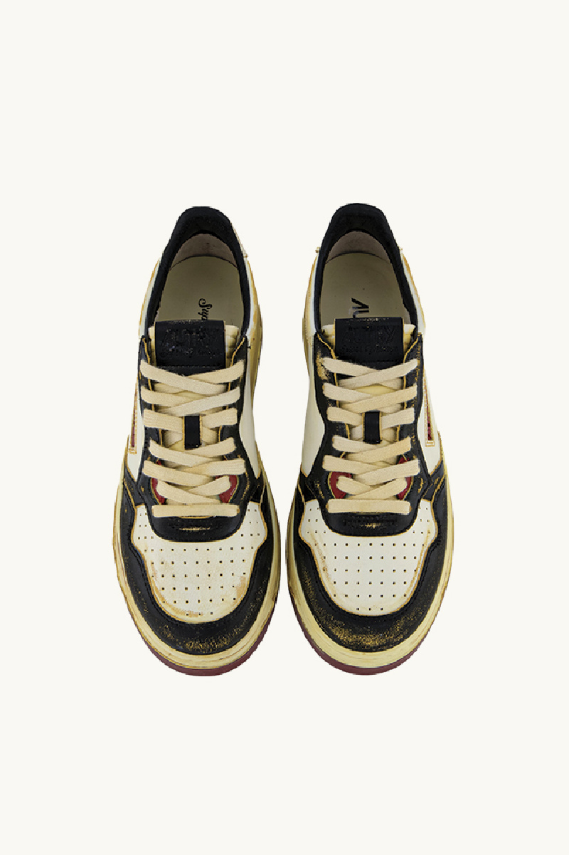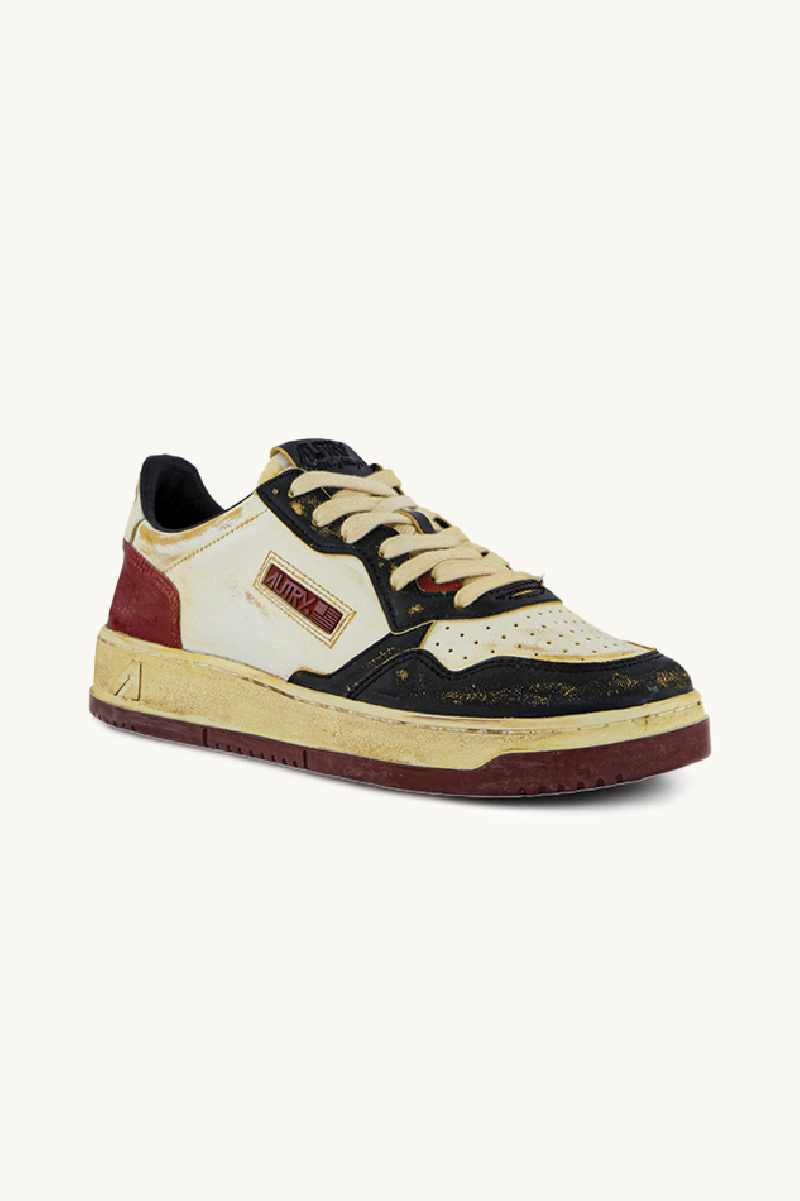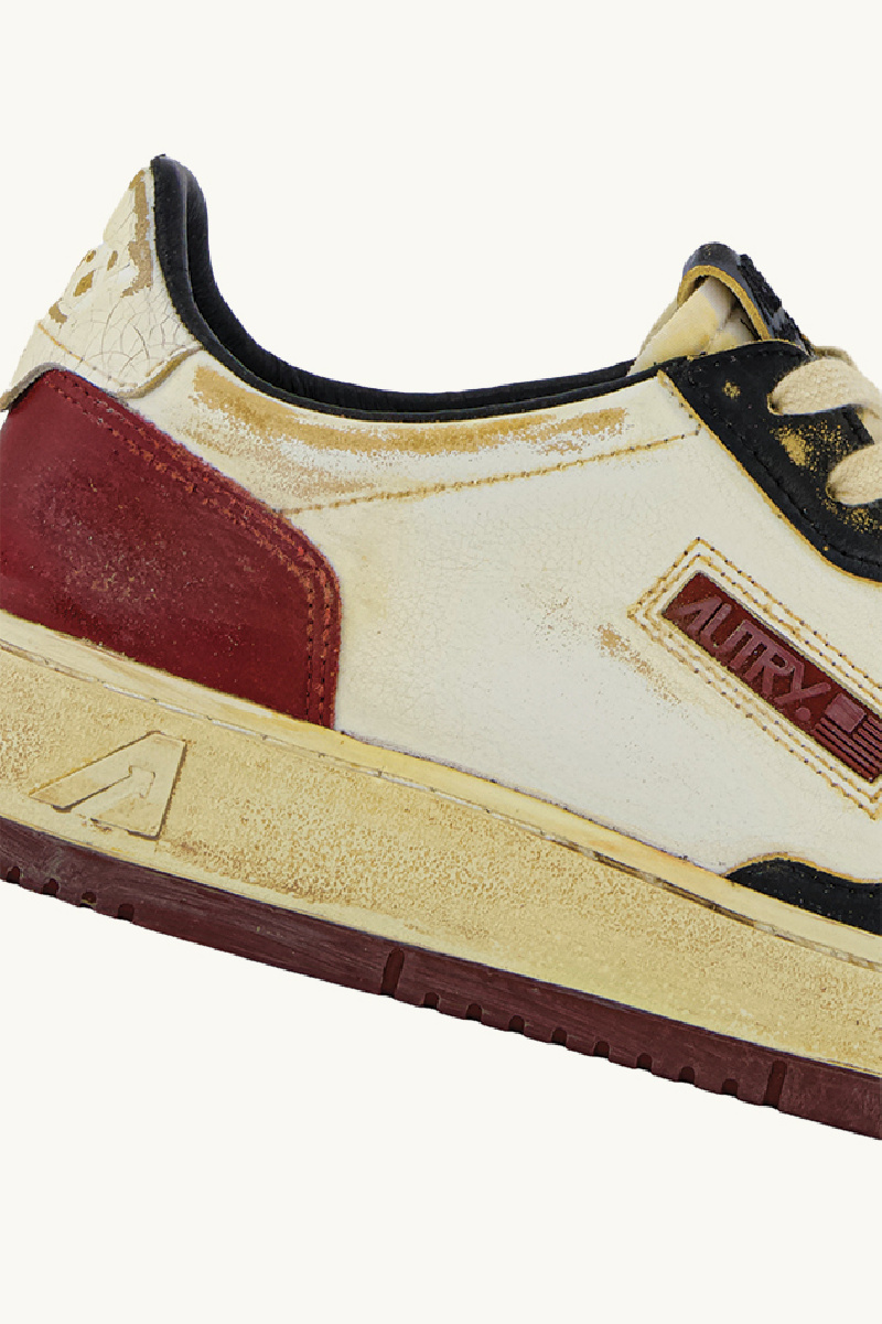 Autry sneakers, man, leather, black and syrah, aged effect, perforated forefoot, rubber sole, lace-up closure, fabric tongue with super vintage label, padded counter, red lettering on outsole.