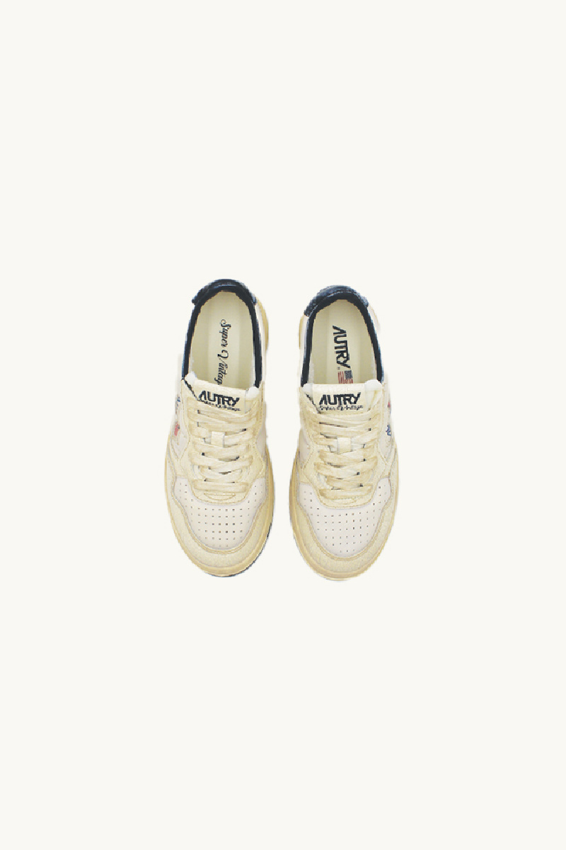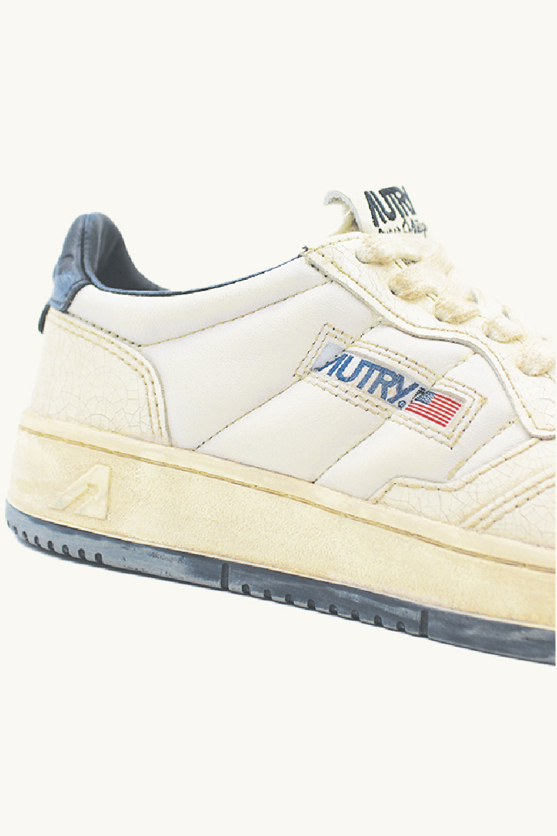 Autry trainers in leather, women's,asparagus and dark blue, distressed and quilted effect, perforated forefoot, unbleached rubber sole, lace-up fastening, fabric tongue with label, padded counter.