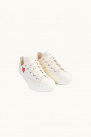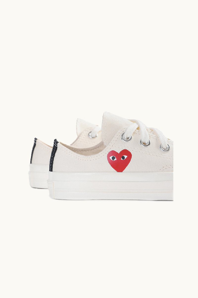 White Converse Chuck Taylor x CDG, featuring a red heart patch logo design on the side, a round toe, a lace-up fastening, a height below the ankle, a rubber sole, and white piping on the back.