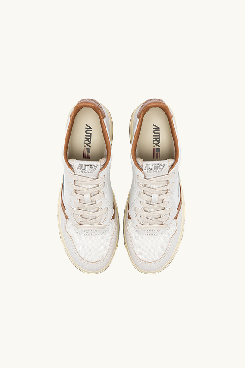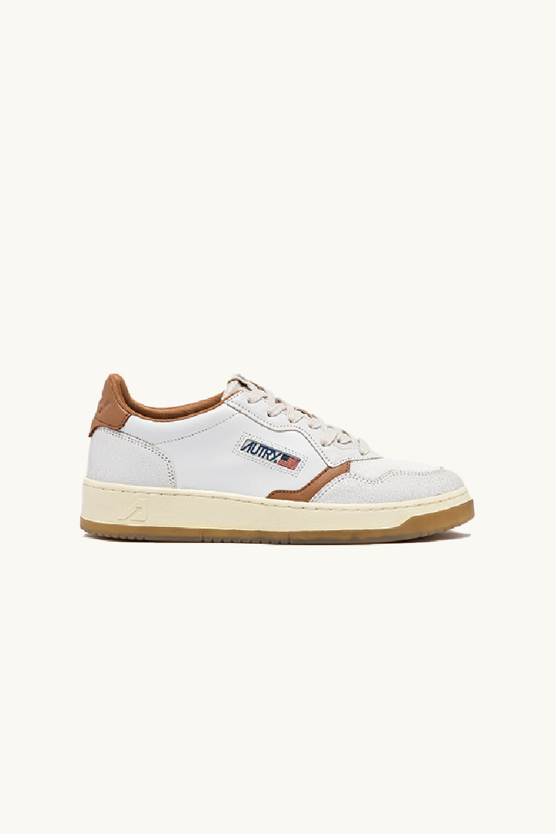 Pair of AUTRY Medalist Low sneakers in leather, offered in white with brown details and cracked-effect perforated forefoot, rubber sole, cotton lace-up fastening. Brown back tongue.