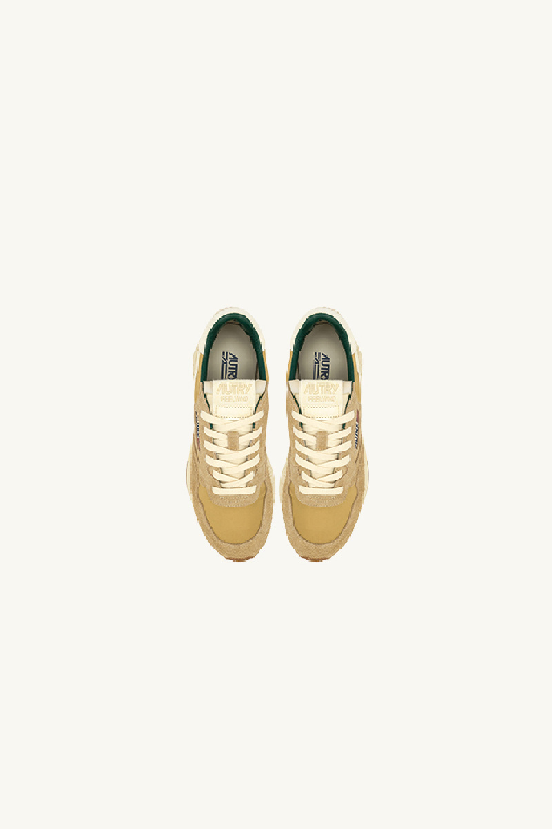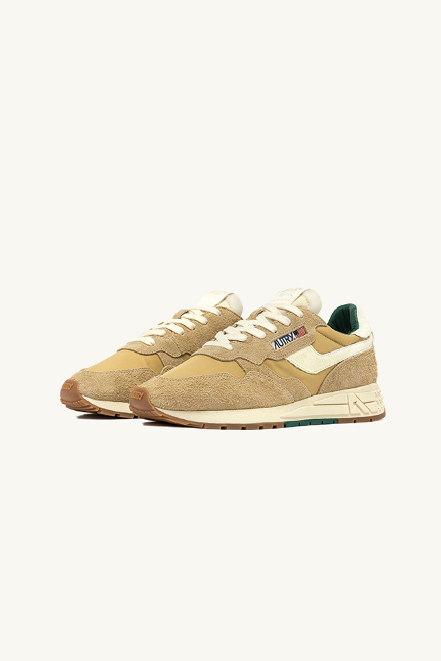 Reelwind Low Autry brand sneaker, beige, in elegant suede and durable nylon, details in off white pony skin.