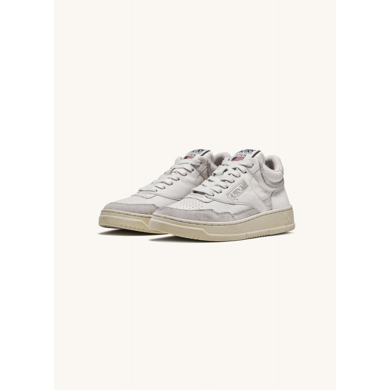 Autry "Open mid" sneakers in smooth white leather, suede inserts, flat cotton laces, signature logo embroidered on outer side and tongue.